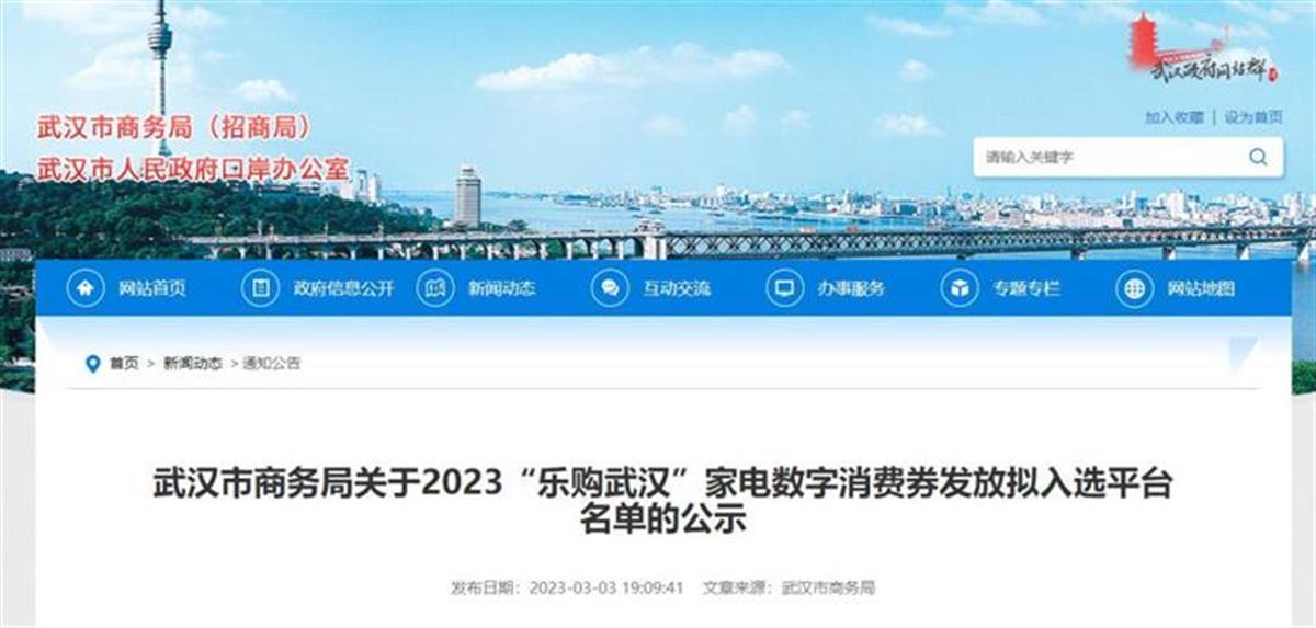 3月3日,武漢市商務局發布關于2023“樂購武漢”家電數字消費券發放擬入選平臺名單的公示。