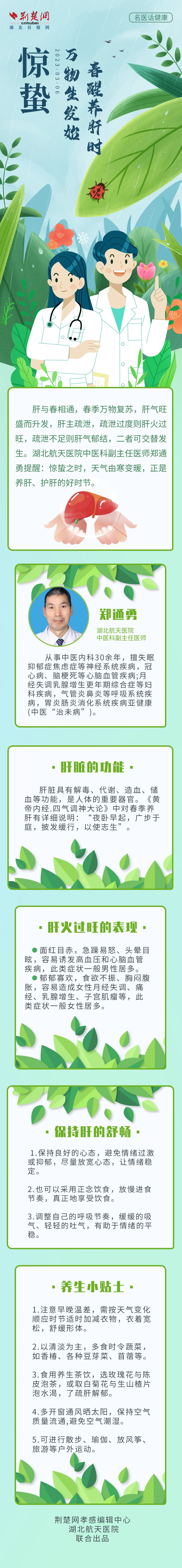 今日驚蟄,萬(wàn)物生發(fā)始,春醒養(yǎng)肝時(shí)。湖北航天醫(yī)院中醫(yī)科副主任醫(yī)師鄭通勇溫馨提醒:驚蟄之時(shí),天氣由寒變暖,注意保持心情暢達(dá),舒肝養(yǎng)身!
