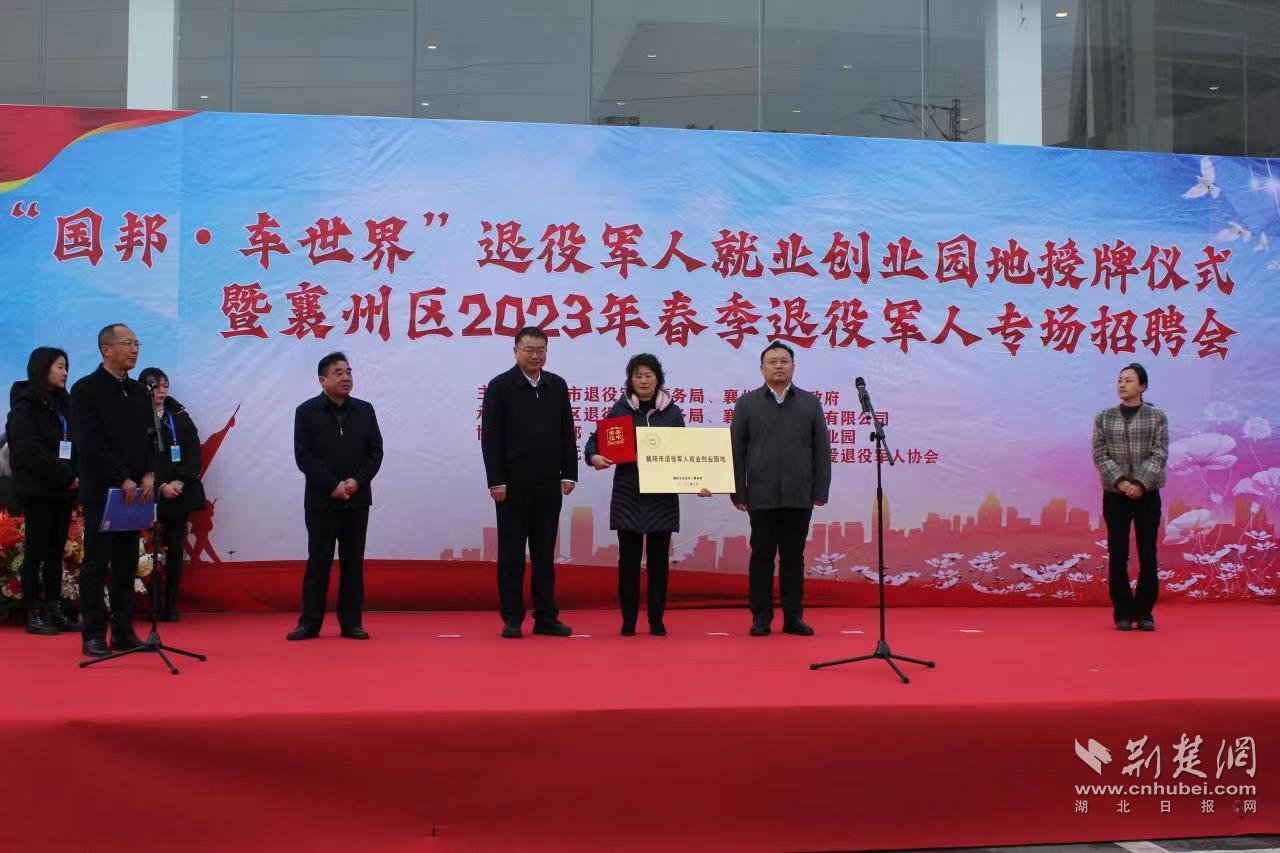 荊楚網(湖北日報網)訊(通訊員李順民 杜永生)3月17日,襄陽“國邦·車世界”退役軍人就業創業園地授牌儀式暨襄州區2023年春季退役軍人專場招聘會在國邦·車世界北門廣場隆重舉行。襄陽市退役軍人事務局黨組書記劉路、襄州區政府副區長陳軍親手將牌匾和證書交到襄陽國邦實業有限公司董事長吳艷手中。