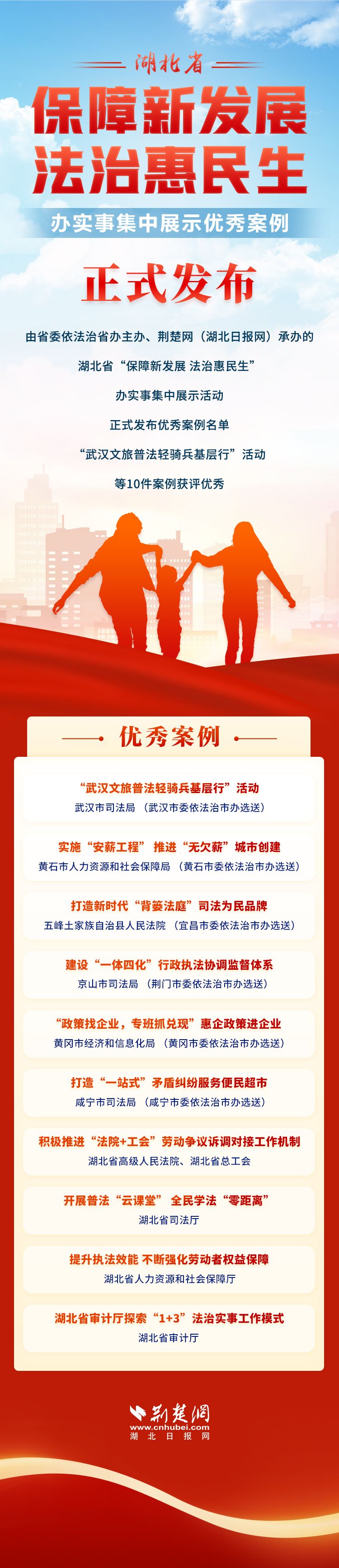 荊楚網(湖北日報網)訊(記者邱玲鵬 通訊員王相生)3月24日,由省委依法治省辦主辦、荊楚網(湖北日報網)承辦的湖北省“保障新發展 法治惠民生”辦實事集中展示活動正式發布優秀案例名單,“武漢文旅普法輕騎兵基層行”活動等10件案例獲評優秀。