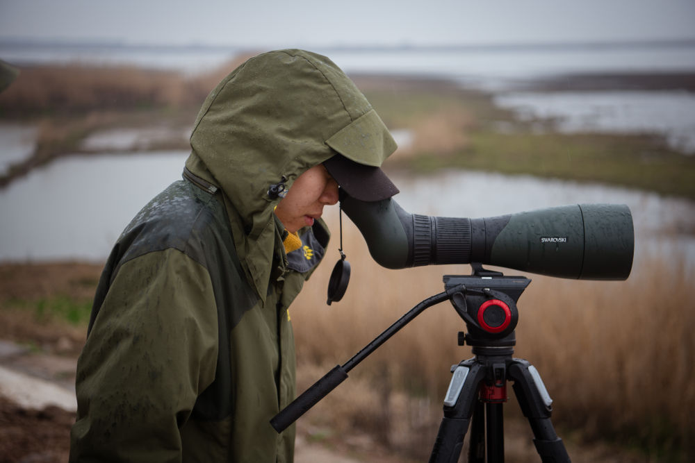 譚文卓使用單筒望遠鏡觀測鳥類(2月16日攝)。