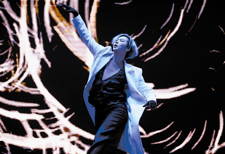 高3米、長10米的舞臺上,實驗戲劇《進入雪景寒林之境》在有限的舞臺空間內為觀眾呈現出了唯美的畫面。燈光設計師袁野以傳世佳作為創作靈感,視覺呈現并不以寫實為基點,而是用燈光設計捏合表演與影像。他說,“傳統藝術虛實相生、黑白互表,我學習這種智慧,力求為‘雪景寒林’創造一個美好且有趣的世界”。服裝造型設計師田湛采用暗金色薄紗、黑色透明巴厘紗與絹本材質相呼應,錯落纏繞的黑色線條暗示著樹枝和雪,在現代的設計中加入中式傳統剪裁,制作出的服裝神氣十足、精美絕倫。