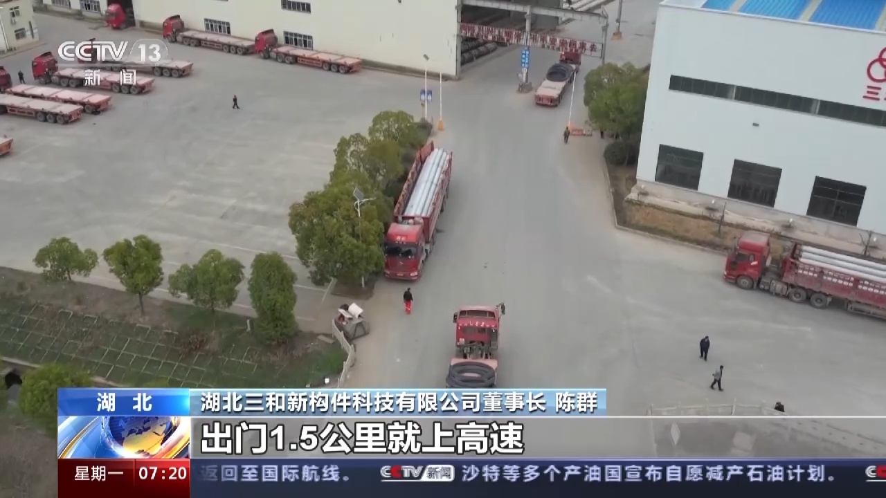湖北三和新構件科技有限公司董事長 陳群:我們廠的原材料進入和產品的銷售,出門1.5公里就上高速,10分鐘到黃岡,不要一個小時就到武漢全境。