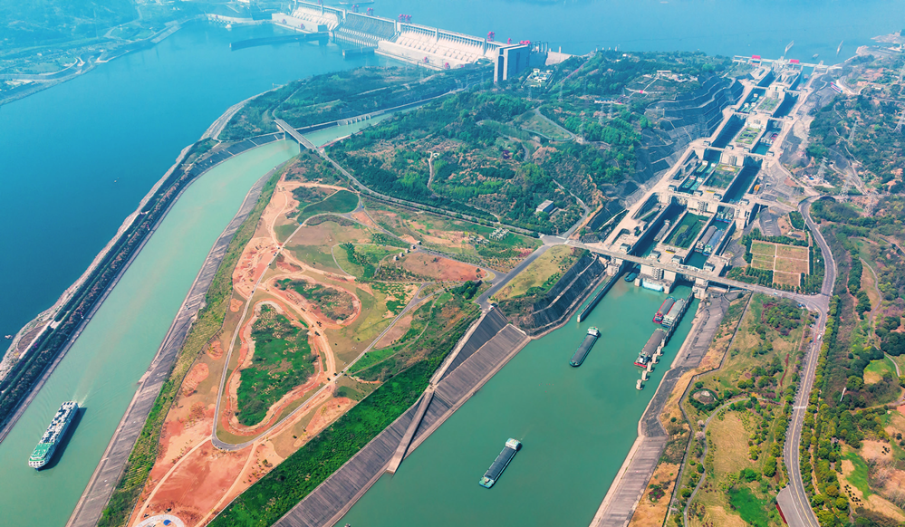 2023 年一季度,三峽樞紐航運通過量 3989.36 萬噸,同比增長 22.08%,創投運以來一季度航運通過量最高紀錄。圖為船舶有序通過三峽雙線五級船閘和升船機(2023 年 4 月 1 日攝) 鄭家裕攝 / 本刊