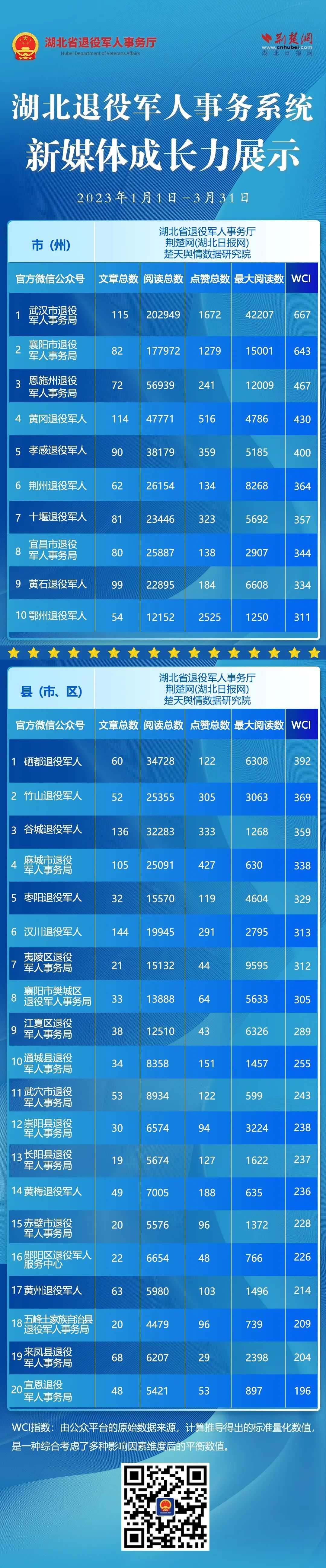 為進一步推動全省退役軍人事務系統打造“大宣傳”工作格局、構建新媒體“宣傳矩陣”,4月13日,湖北省退役軍人事務廳聯合荊楚網(湖北日報網)、楚天輿情數據研究院,對2023年第一季度全省退役軍人事務系統新媒體成長力進行展示。