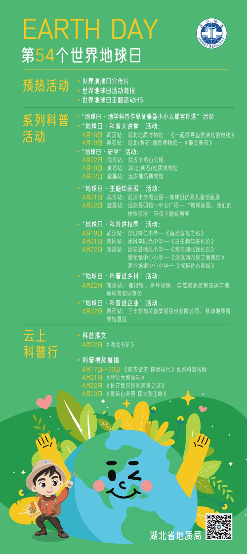 荊楚網(湖北日報網)訊(記者 趙秀琳 通訊員 劉漢生)今年4月22日是第54個世界地球日,主題為“珍愛地球 人與自然和諧共生”。為引導社會公眾樹立生態文明理念,建立正確的自然資源觀,4月17日至4月23日,湖北省地質局將開展為期一周、形式多樣的科普宣傳活動,期待您的參與!