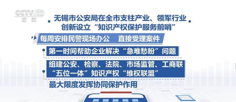 無錫市公安局在全市支柱產(chǎn)業(yè)、領(lǐng)軍行業(yè)創(chuàng)新設(shè)立“知識產(chǎn)權(quán)保護(hù)服務(wù)前哨”,并納入《全市公安機(jī)關(guān)服務(wù)經(jīng)濟(jì)護(hù)航發(fā)展十六項(xiàng)舉措》強(qiáng)力推進(jìn)。每周安排民警現(xiàn)場辦公直接受理案件,第一時(shí)間幫助企業(yè)解決“急難愁盼”問題,同時(shí),組建公安、檢察、法院、市場監(jiān)管、工商聯(lián)“五位一體”知識產(chǎn)權(quán)“維權(quán)聯(lián)盟”,最大限度發(fā)揮協(xié)同保護(hù)作用。