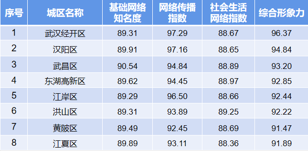 網絡傳播指數中,排在榜單前三位的是武漢經開區、漢陽區和江岸區,指數分別為97.29、97.16和96.50,表明相關轄區獲省級以上媒體和商業資訊平臺報道較多。社會生活網絡指數前三名是洪山區、東湖高新區和武昌區,分別為89.25、88.97和88.89,表明相關區域生態環境、治安管理、文化旅游、城市管理、產業促進、設施聯通、貿易便利、綠色發展、能力建設、健康衛生、營商環境、民生福祉、文化教育等領域整體形象較好。