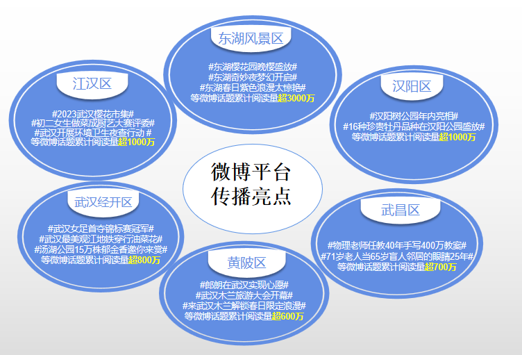 從各區在微博平臺的傳播亮點來看,涉及文旅、教育、民生、消費等相關話題備受網民關注。3月17日“浪漫武漢一路生花”2023武漢櫻花市集在江漢路步行街啟動。在市集上不僅有鮮花鋪滿整條街,現場還設置了像櫻花郵局、企鵝雜貨鋪、設計師原創局等打卡點,來讓逛市集的市民朋友們不虛此行。3月20日,來自全國各地300余名微博大V齊聚武漢,首站打卡東湖。徜徉在湖光山色的東湖綠道及滿園浪漫的東湖櫻花園,大V們紛紛用手機記錄武漢的春天。3月24日,“武漢東湖奇妙夜·光的Show”將在東湖聽濤景區開幕,用50天的時間點亮東湖之夜。“櫻花瀑布”從天而降,櫻花大道光影絢爛,大型無人機表演演繹3D造型……東湖景區引進四大主題系列燈組,為游客帶來沉浸式光影體驗秀。3月30日,武漢經開區湯湖公園舉辦的郁金香花展吸引了眾多游客前來。這些郁金香包括白日夢、潮汐等近20個品種15萬株,而且花期各不相同,展出面積超過4000平方米,配合湯湖公園的景觀讓游客既能賞花又能春游。3月31日,2023中國·武漢木蘭旅游大會在黃陂區木蘭草原景區正式開幕。大會上揭曉了“木蘭游”十大精品民宿,發布了“木蘭游”高質量發展“黃金十條”,世界著名鋼琴大師郎朗特邀出席,發出“相約木蘭故里,共赴美好之旅”的邀約。系列文旅活動配以微博話題造勢,東湖高新區#東湖奇妙夜夢幻開啟#、江漢區#2023武漢櫻花市集#、武漢經開區#武漢最美觀江地鐵穿行油菜花#、黃陂區#來武漢木蘭解鎖春日限定浪漫#等涉及春日賞花、網紅地打卡類文旅話題關注度較高。