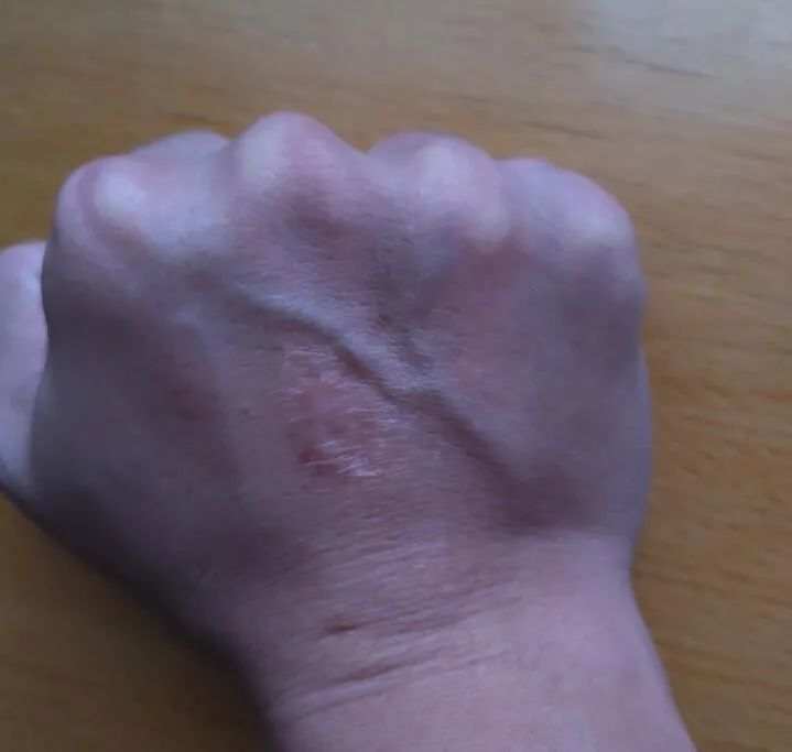 他手背上仍未愈合、