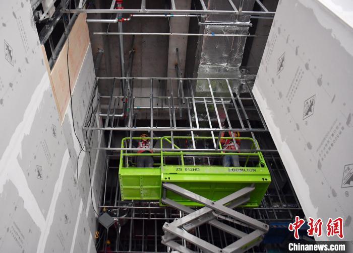 走進館內,吊頂、幕墻、地板等班組的施工人員也在緊張作業。李龍碩稱,目前吊頂施工已完成將近80%,4月底所有的吊頂工作將完工。此外,館內內墻木飾板材料已全部到場,計劃4月底安裝完成。
