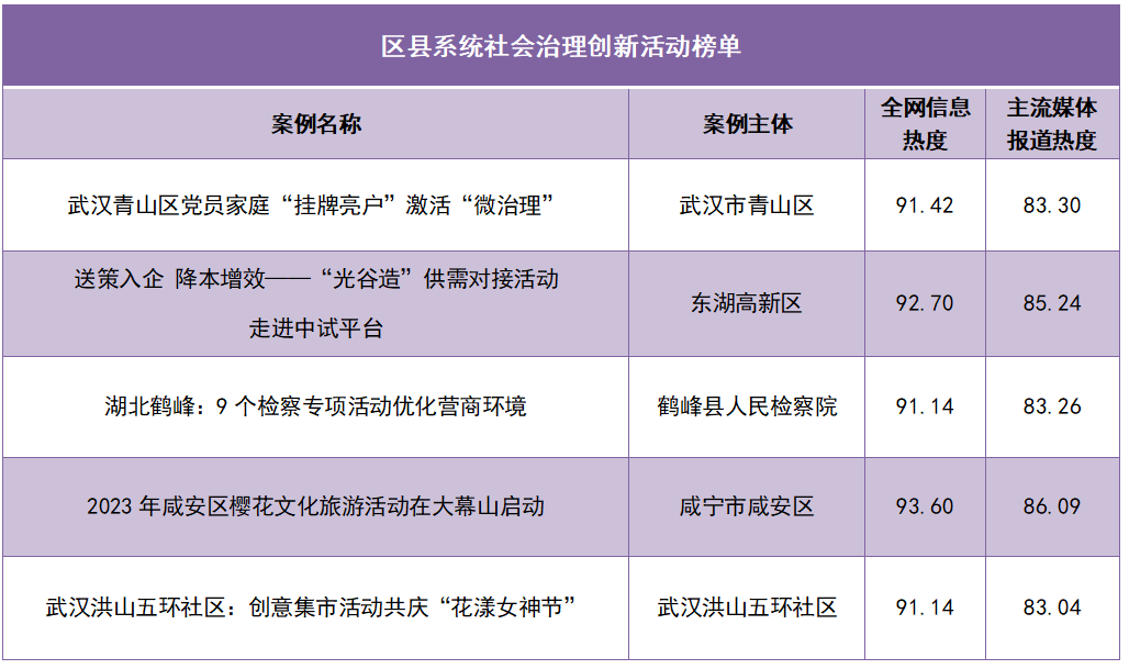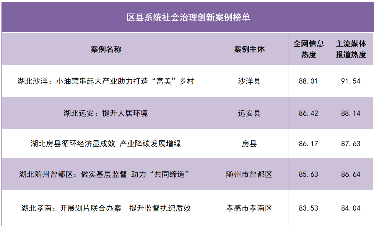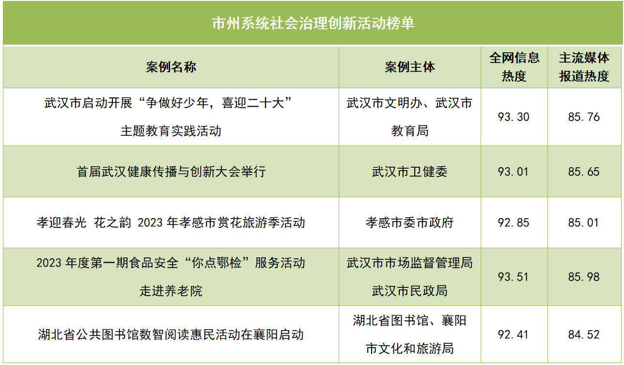 為展現我省社會治理創新成果,4月起,荊楚網(湖北日報網)、楚天輿情數據研究院每月通過大數據系統對省內社會治理創新案例、熱點活動進行分析,并分省直、市州和區縣三個榜單發布,供參考借鑒。