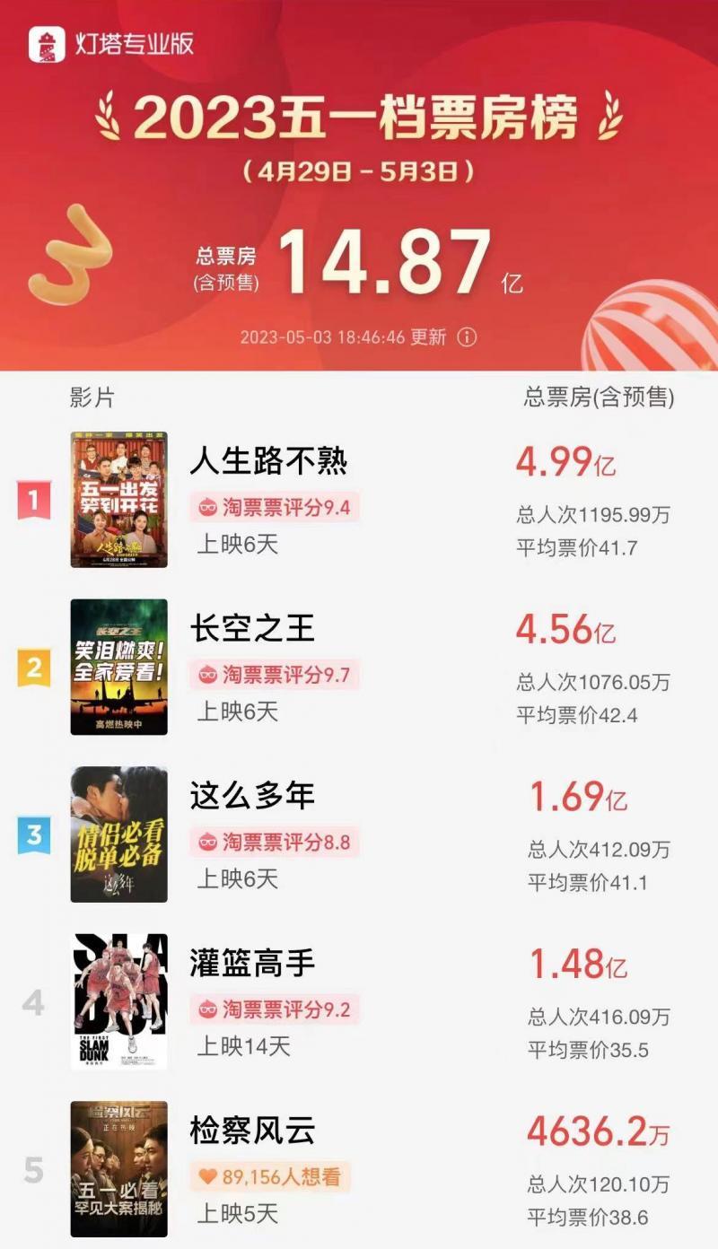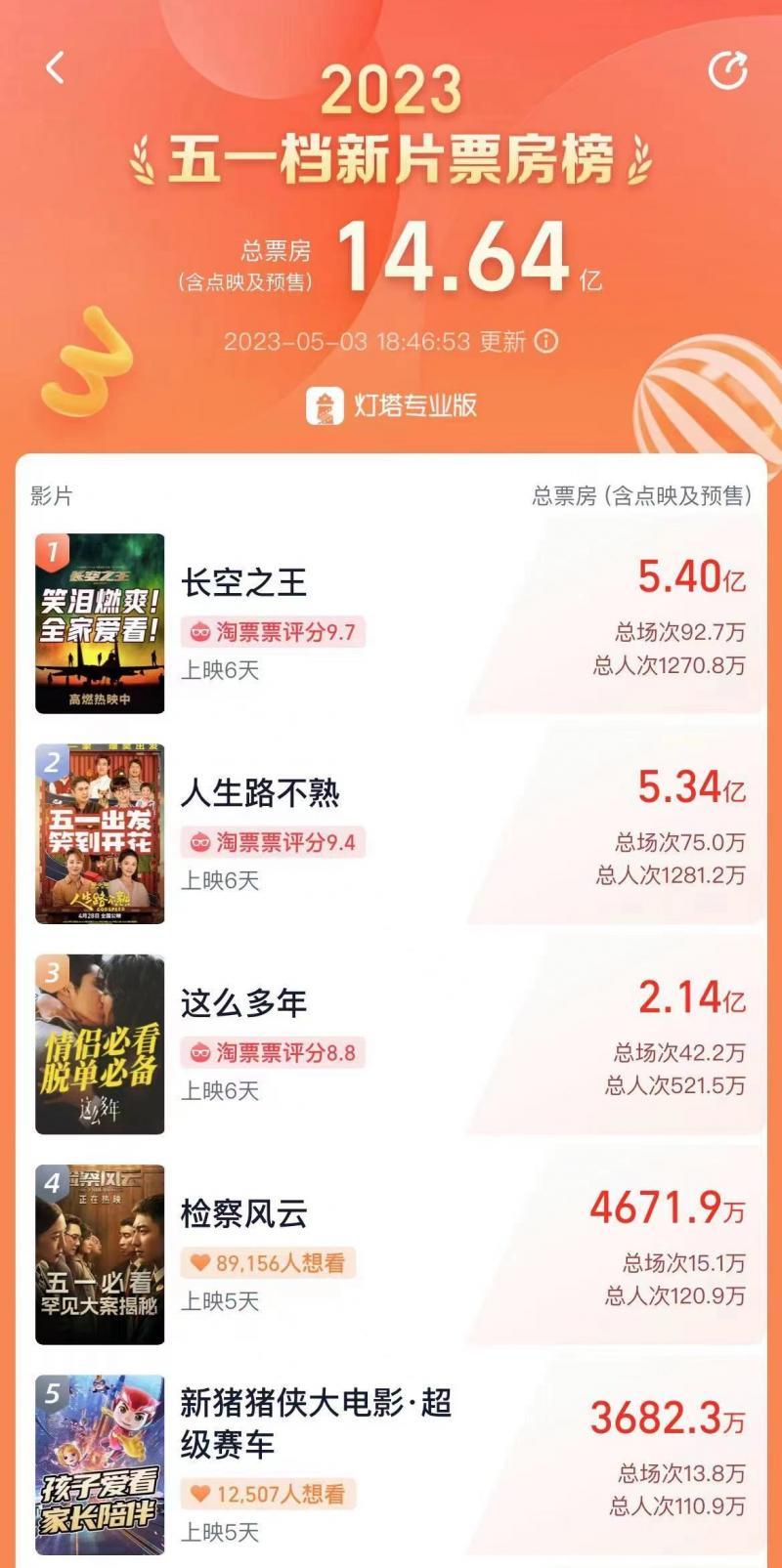 據(jù)燈塔專業(yè)版數(shù)據(jù),截至5月3日18時,2023年五一檔票房為14.64億,這個成績是史上五一檔票房第三高,排在前兩名的是2019年五一檔(16.74億人民幣),2021年五一檔(15.27億)。其中《長空之王》和《人生路不熟》票房都突破五億。