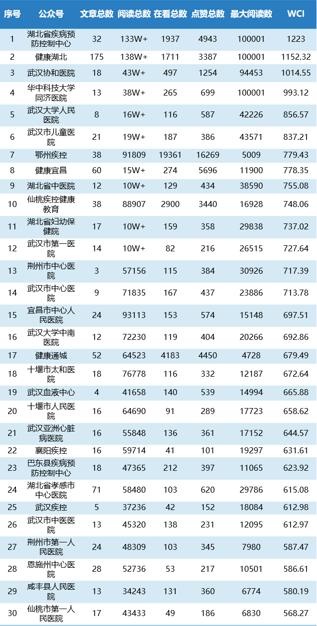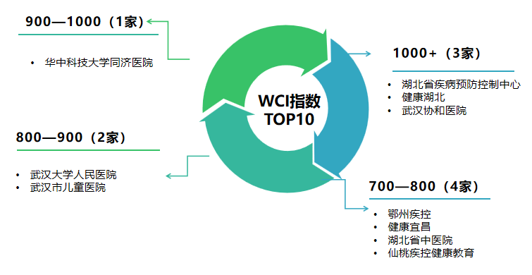 從WCI指數來看,本期TOP10賬號WCI值整體較之前稍有變化,WCI值超過1000+的賬號有3家,分別是“湖北省疾病預防控制中心”“健康湖北”“武漢協和醫院”;900-1000指數區間的有1家,為“華中科技大學同濟醫院”;800-900指數區間的有2家,分別是為“武漢大學人民醫院”“武漢市兒童醫院”;700-800指數區間有4家,分別為“鄂州疾控”“健康宜昌”“湖北省中醫院”“仙桃疾控健康教育”。