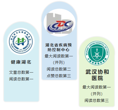 本期榜單各項指數與上期相比出現一定幅度的上升。排名前十位的單位名次變化不大。“湖北省疾病預防控制中心”以最大閱讀數第一、閱讀總數第二、點贊總數第三排在榜首;“健康湖北”以文章總數第一、閱讀總數第一排在第二位;“武漢協和醫院”則以閱讀總數第三,最大閱讀數第一(并列)排在第三名。值得一提的是,部分賬號單項指數表現搶眼,如“鄂州疾控”雖然排在第七位,但在看總數、點贊總數均為單項第一;“華中科技大學同濟醫院”排在第四位,最大閱讀數也是并列第一、平均閱讀數增量第一。