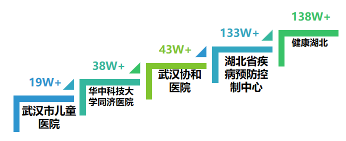 從文章閱讀總數來看,整體數值變化不大。“健康湖北”成績亮眼,以閱讀總數第一領跑,其閱讀總數達138W+,遙遙領先。“湖北省疾病預防控制中心”以133W+排第二;“武漢協和醫院”以43W+位列第三名,“華中科技大學同濟醫院”以38W+緊隨其后排第四,“武漢市兒童醫院”以19W+排第五名。