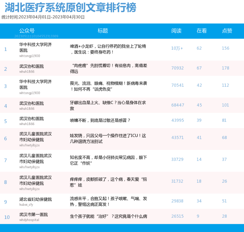4月,原創文章TOP10的推文共來自5家微信賬號。“華中科技大學同濟醫院”攜2篇文章入榜;“武漢協和醫院”攜3篇文章入榜;“武漢市兒童醫院”攜3篇文章入榜;“湖北省婦幼保健院”“武漢市第一醫院”分別攜1篇文章入榜。