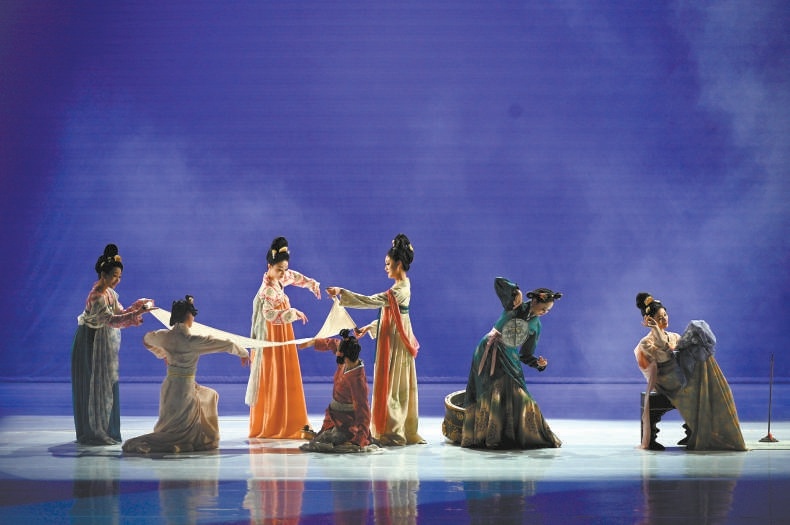 《門》的立意首先值得肯定。這部由西安演藝集團出品、西安歌舞劇院演出的作品以唐朝長安城為背景,以司閽(守門人)為引,從唐代名畫《搗練圖》切入,展開長安城108坊的眾生畫卷。9個篇章中分別融入了永興坊、翊善坊、安德坊等坊名,借老尼與宦人、將軍與丑娘、九寶與乞兒、刀客與狂生的感情線索,縮影了盛世之下的世事浮沉與人生百態。