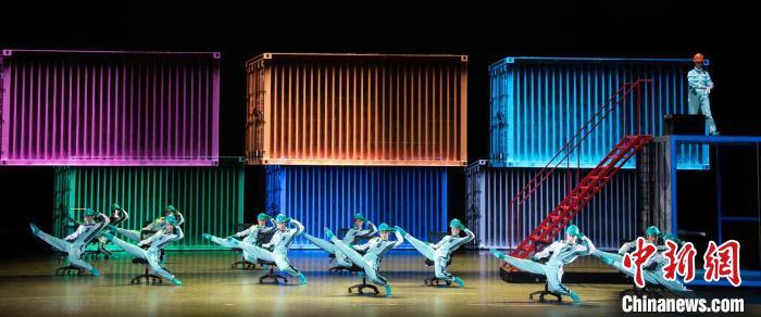 高聳如林的橋吊繁忙作業,形態各異的運輸車輛川流不息,五彩斑斕的集裝箱層層堆砌,起重機、龍門吊、輸送帶,寧波舟山港繁忙火熱的工作場面被“搬”進國家最高藝術殿堂。寧波市歌舞劇院的50余位舞者化身大港建設者,用舞蹈語匯講述了寧波舟山港的奮斗往事,歷史在宏大場景中徐徐展開。全劇展現了寧波人的自強精神,用“硬核”作品展現了寧波舟山港的“硬核力量”。