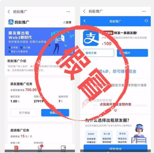 近日,支付寶開放平臺(tái)接到多位用戶反饋,在朋友圈等處看到號(hào)稱通過 “朋友圈出租”做推廣任務(wù)的賺錢活動(dòng),這些活動(dòng)打著“螞蟻推廣”或“支付寶推廣”等旗號(hào)。