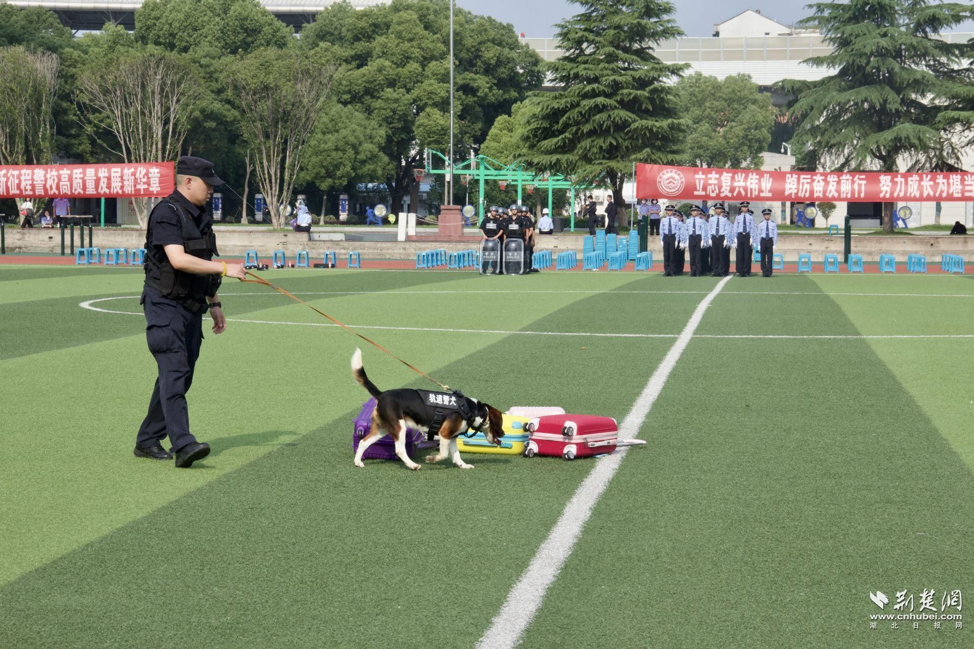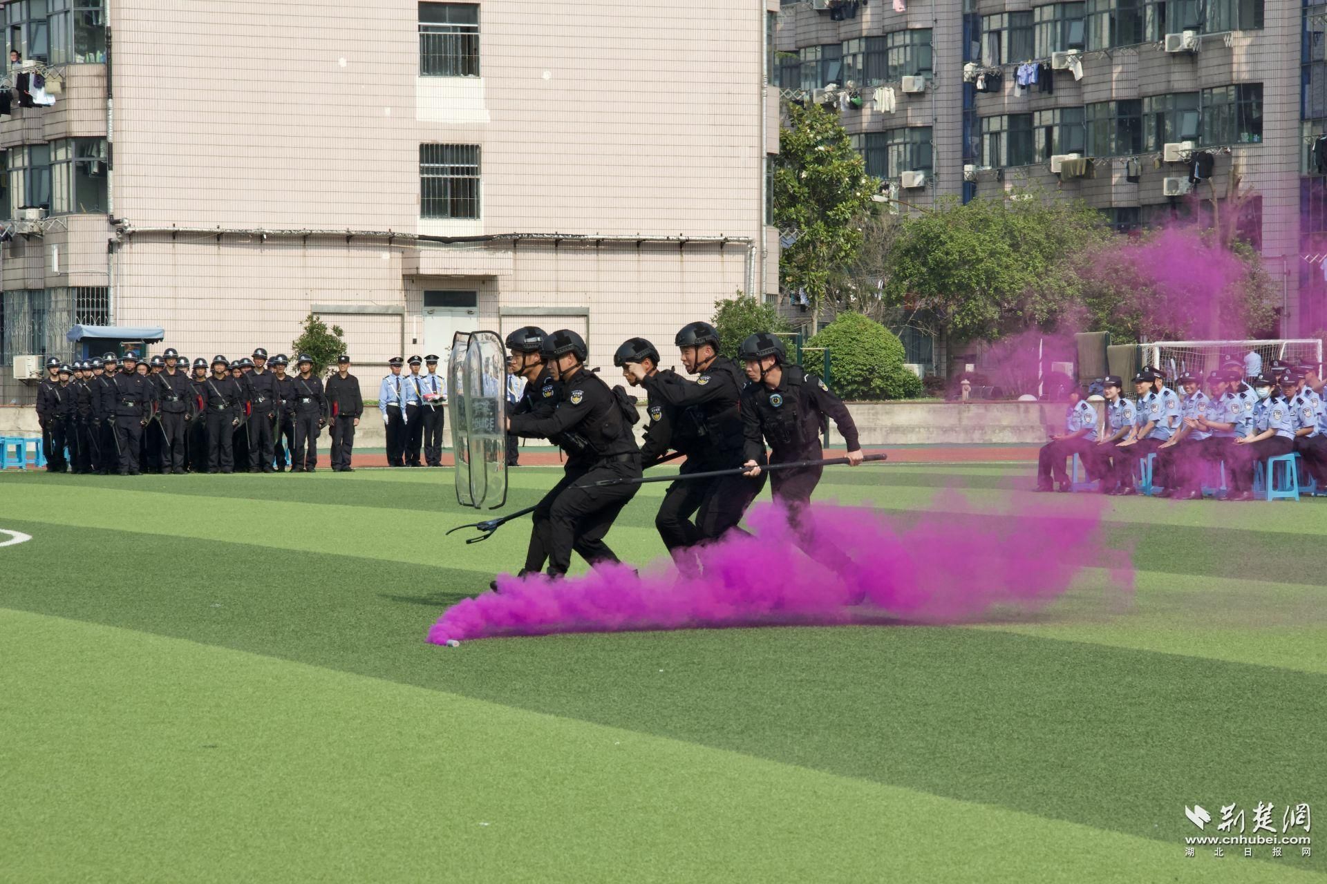 隨著警旗入場、警歌奏響,武漢警官職業(yè)學院的同學們面對警旗重溫訓詞。該校警察管理系學生帶來隊列示范表演、反恐手語表演和盾牌表演,警容嚴整、精神飽滿,盡顯警校青年風采。武漢市公安局軌道交通分局快反機動隊則帶來最小作戰(zhàn)單元和警犬類表演活動,亮點頻頻,點燃現(xiàn)場熱情。最后,武漢市公安局東西湖分局巡警大隊快反隊進行了反恐處突綜合演練,將現(xiàn)場氣氛帶至高潮。