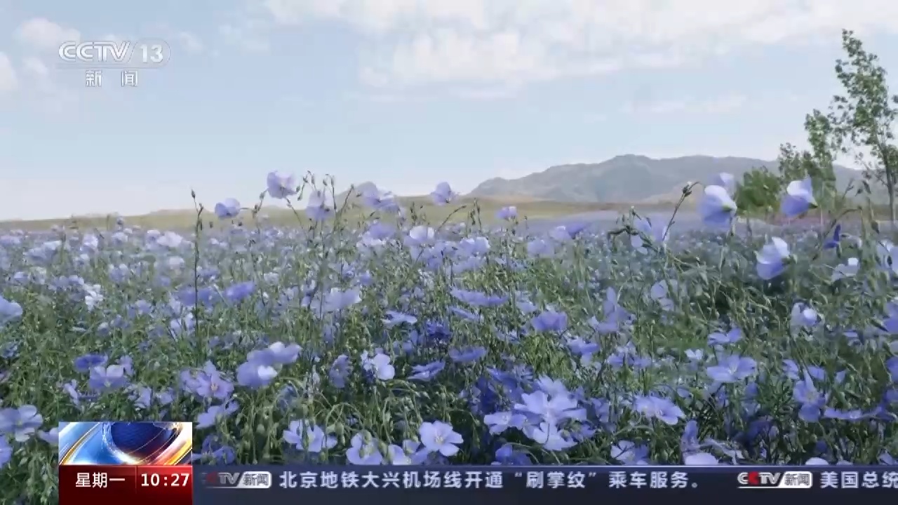 大家看我手里拿的這束花,除了芍藥之外,還有藍香芥、油菜花、大濱菊和亞麻花,它們都是天山花海這個季節盛開的花。這個亞麻花要特別給大家介紹一下,它非常神奇,每天上午開放,下午凋謝。除了花美觀,亞麻籽可以榨出食用油,提取出來的亞麻纖維也是柔軟耐磨,可以用來做高級服裝。不僅是芍藥和亞麻,當地還從薰衣草等花中提取香料、精油,通過花經濟和農副產品深加工,結合休閑旅游打造農旅主題觀光基地,天山花海每年收益可達近10億元。
