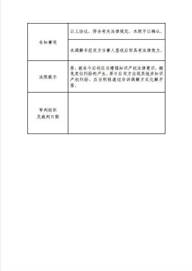 民事調解工作最重要的是引導當事人理性解決紛爭,不僅要把工作做到訴中,更要延展到訴前。知識產權類的簡單案件存在案件量大、權利義務關系清晰、批量案件較多等特點,為了引導市場主體通過多元解紛渠道高效化解矛盾,洪山區法院表格式民事調解書中特別添加了法官提示,引導當事人積極通過非訴途徑化解糾紛,推動訴源治理工作進一步發展。