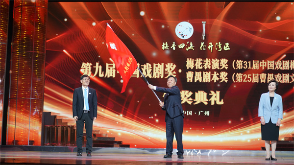 中國劇協(xié)分黨組書記、駐會副主席陳涌泉,中共廣州市委常委、宣傳部部長杜新山,上海市文聯(lián)黨組書記、專職副主席夏煜靜,交接中國戲劇獎·梅花表演獎旗幟