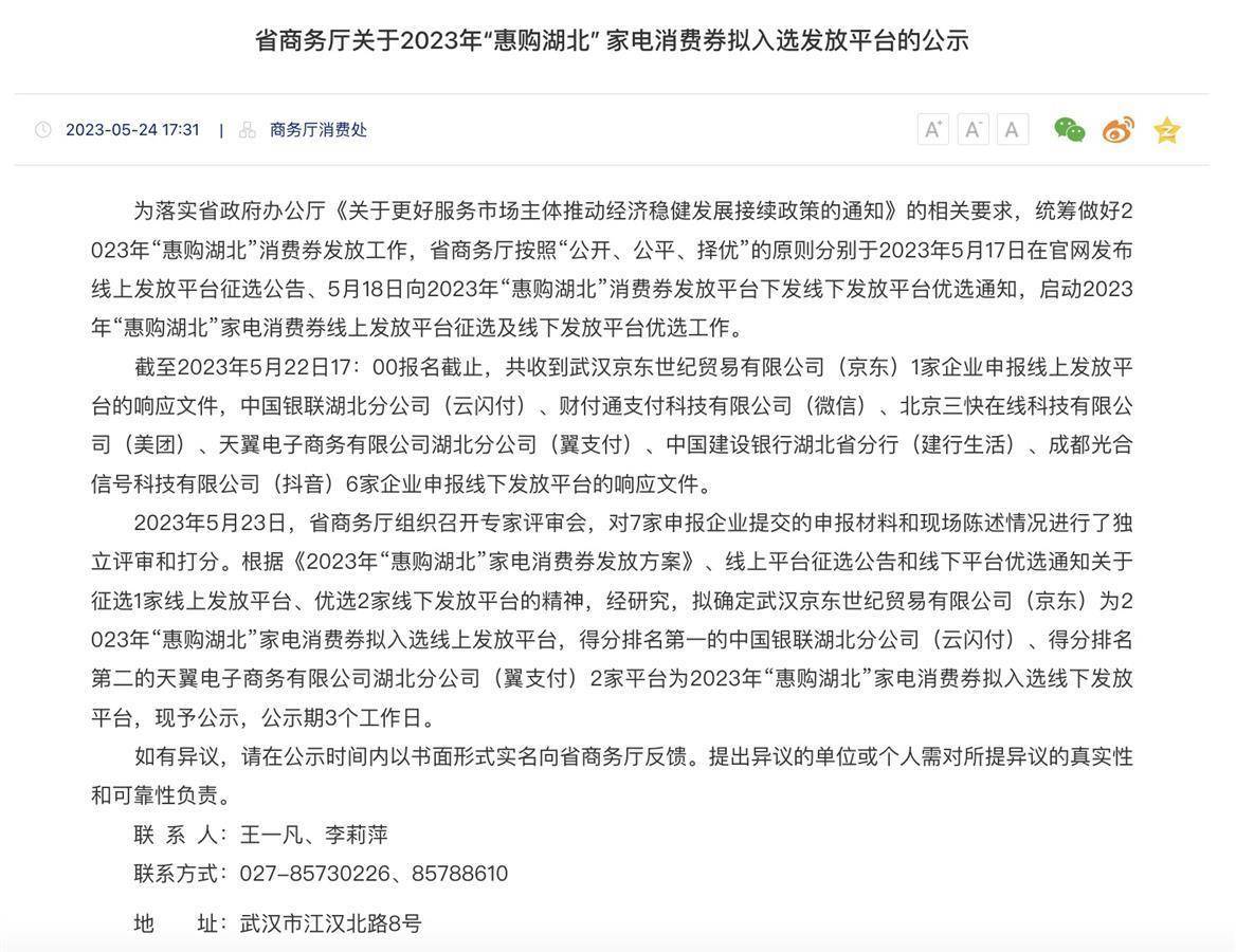 湖北日報訊(記者李朝霞)5月24日,省商務廳發布《關于2023年“惠購湖北” 家電消費券擬入選發放平臺的公示》,根據公示,擬確定武漢京東世紀貿易有限公司(京東)為2023年“惠購湖北”家電消費券擬入選線上發放平臺,中國銀聯湖北分公司(云閃付)、天翼電子商務有限公司湖北分公司(翼支付)2家平臺為2023年“惠購湖北”家電消費券擬入選線下發放平臺。