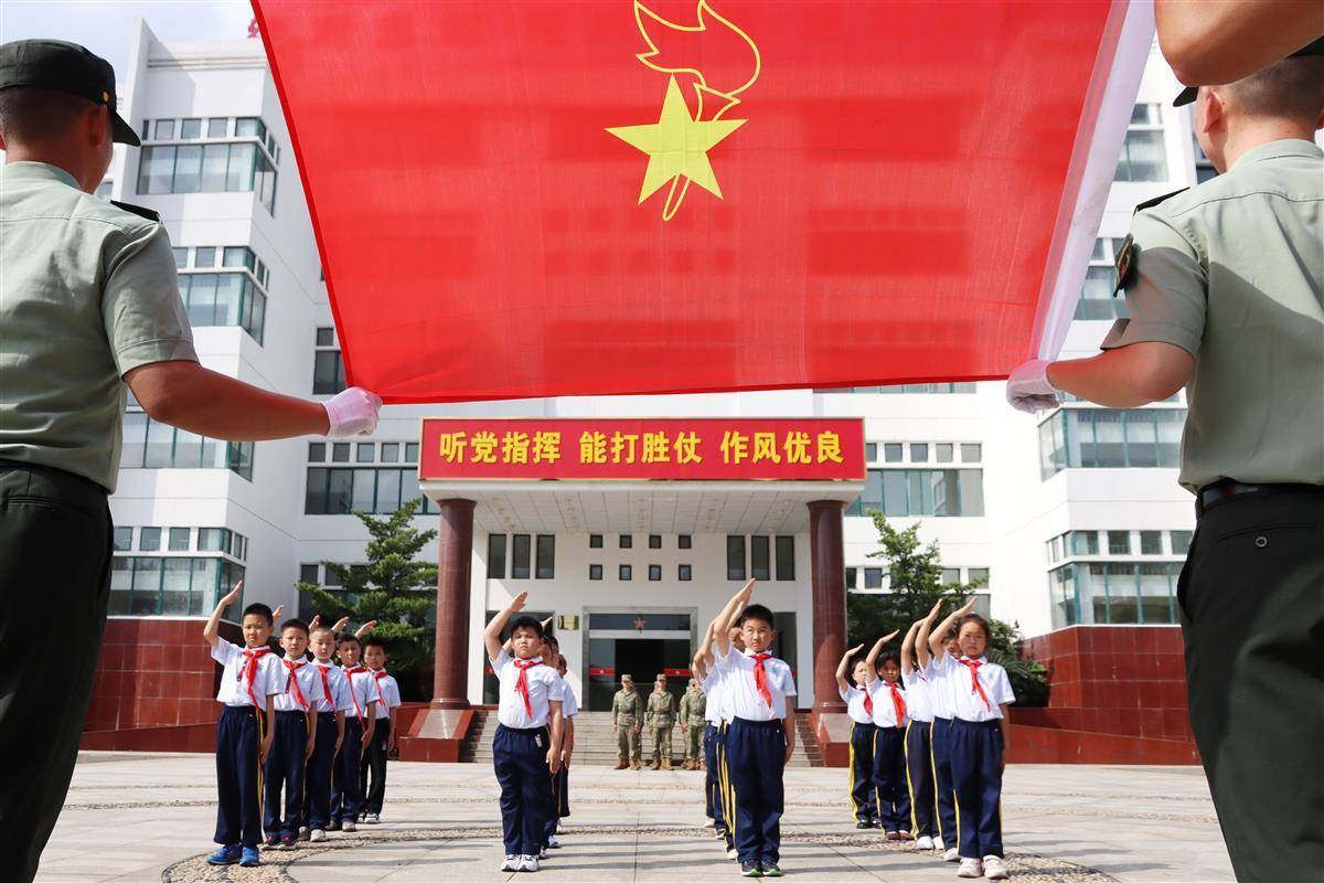 在軍營辦公樓前,升旗儀式和少先隊員宣誓儀式是官兵送給孩子的特殊禮物,孩子們也將鮮艷的紅領巾獻給了最可愛的解放軍叔叔們,解放軍還給參加活動的小學生贈送“六一”兒童節禮物。
