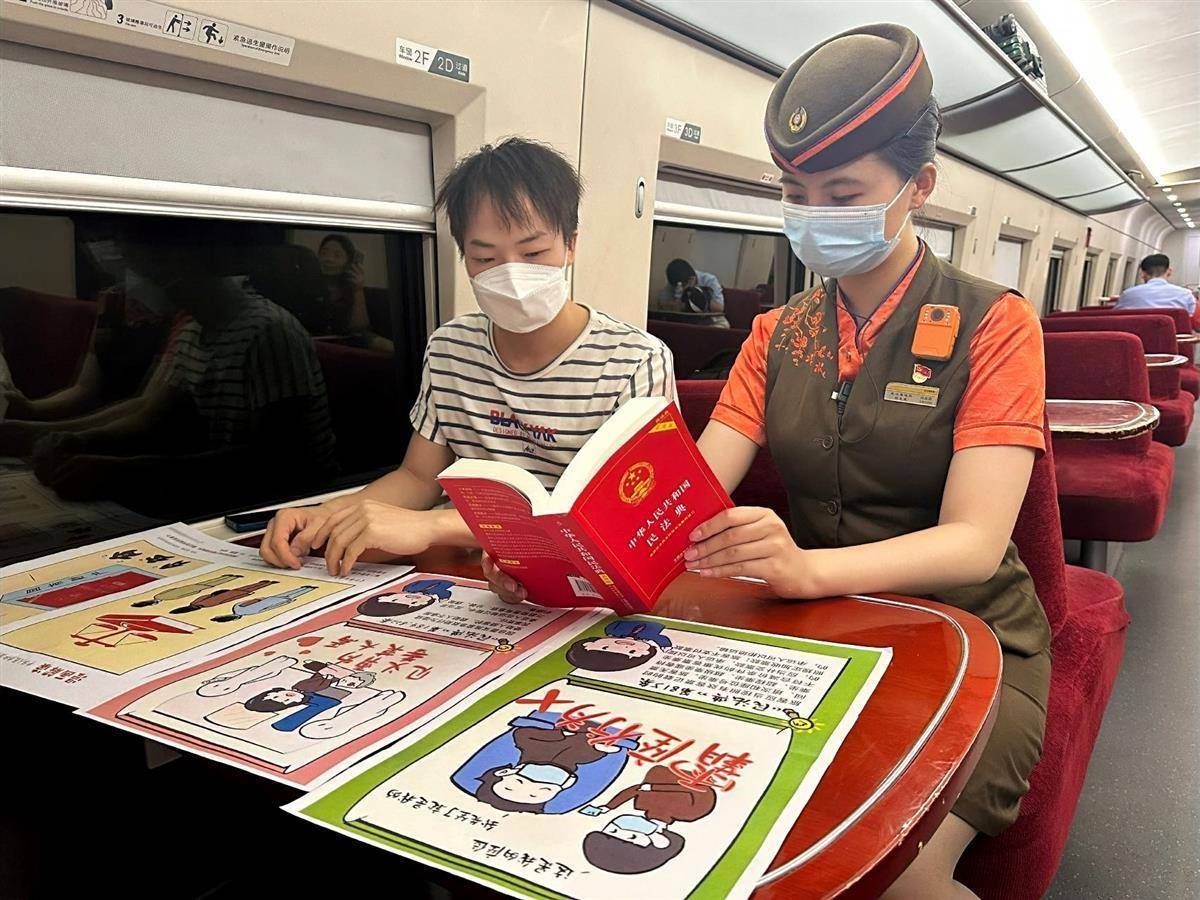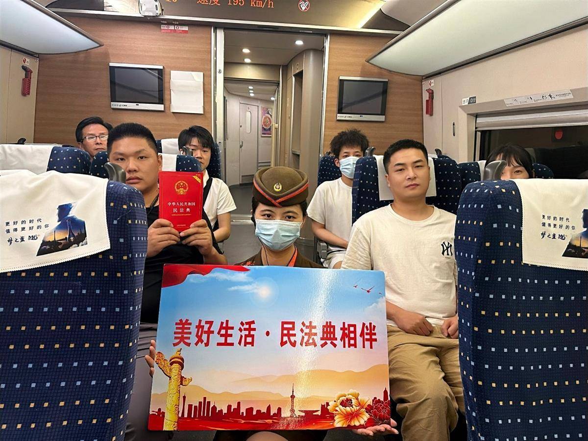 湖北日報訊(通訊員劉瓊、黃潔)5月28日,武漢鐵路局武漢客運段在宜昌東開往深圳北的G1034次列車上,開展了以“美好生活·民法典相伴”為主題的普法宣傳活動,通過給廣大旅客進行普法宣傳,讓大家知法、守法、用法、懂法,讓《中華人民共和國民法典》真正走到大家身邊,走進大家心里,真正成為大家的“社會生活百科全書”,一起用法律維護良好的社會秩序。