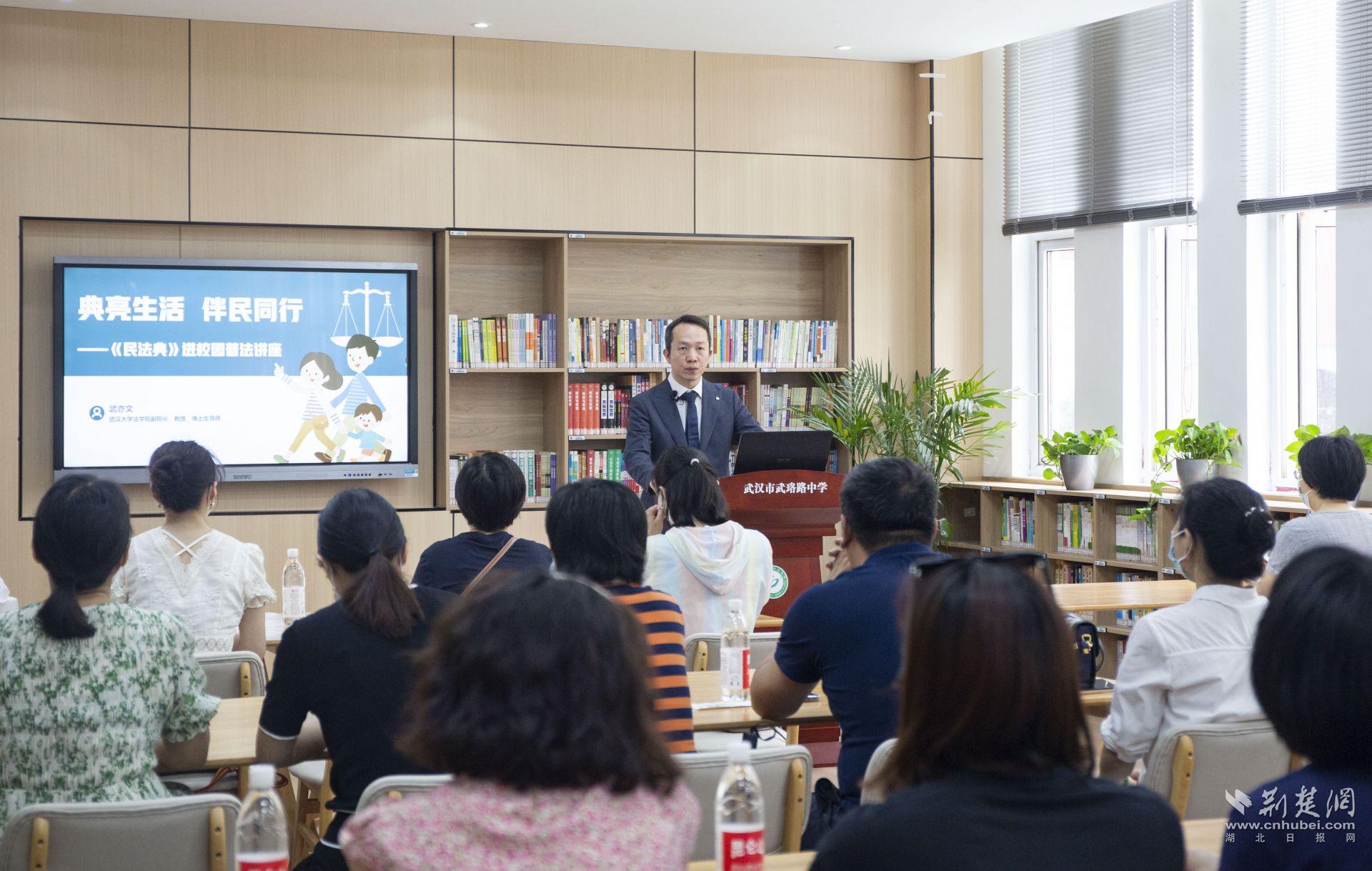 今年5月是第三個“民法典宣傳月”。本次直播課邀請省“八五”普法講師團成員,武漢大學法學院副院長、教授、博導武亦文進行“‘典’亮生活 伴民同行”主題授課。武珞路中學東湖校區邀請了學生家長到場聽課。