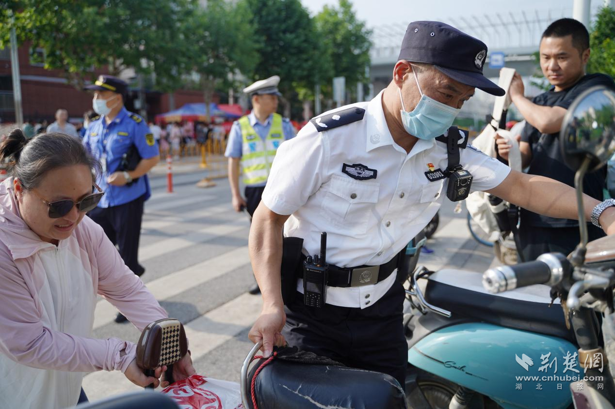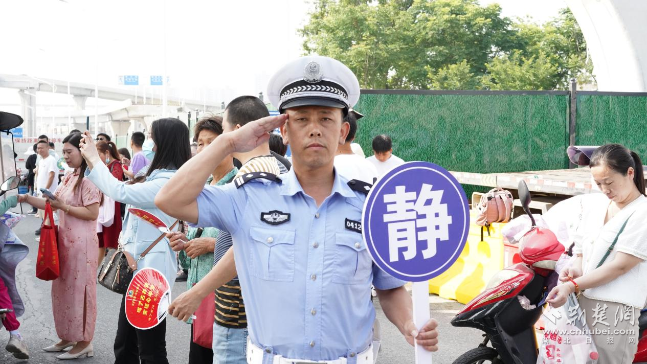 “家長請靠路邊,注意來往車輛。”7時起,武漢市晴川高級中學考點外的人流、車流逐漸增多,十余名交警奔忙于路口間指揮通行,汗水逐漸浸濕衣帽。考點入口處在3名派出所民警、3名輔警及3名特警的維持下,秩序井然。在黃陂,護考交警還特別制作“靜”字手持提示牌,為考點降噪。