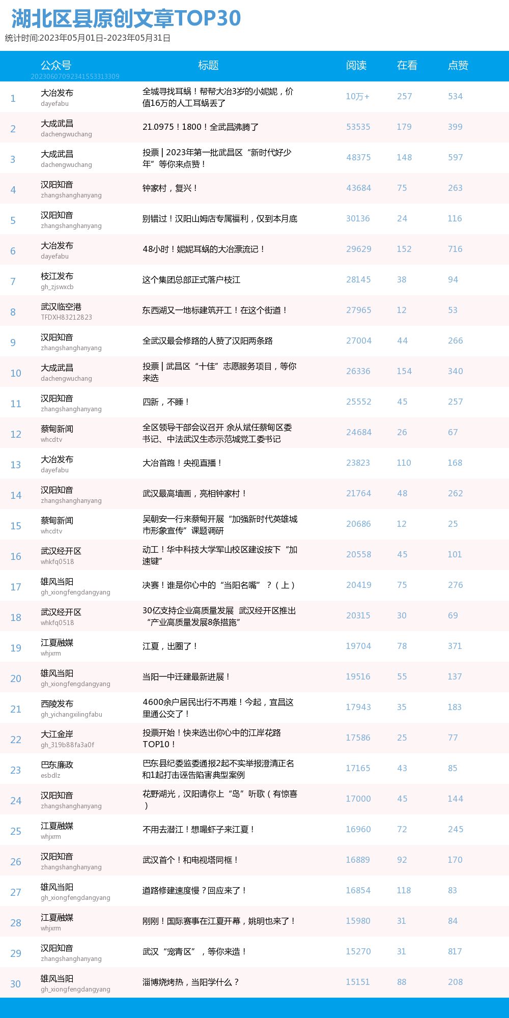 圖為2023年5月1日-2023年5月31日湖北區縣系統文章排行榜