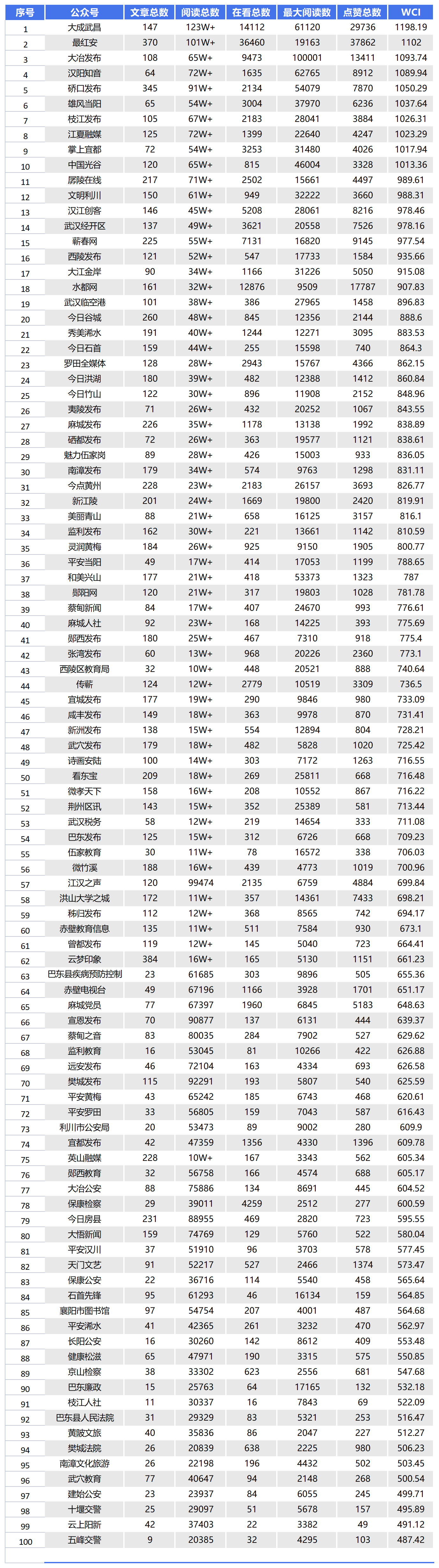 從具體排名來看,“大成武昌”衛冕冠軍;“最紅安”排在第二位;“大冶發布”擠進前三,位居第三名。本期前十變化不大,“中國光谷”排名上升7位,排在第十名。另外有共有6家賬號表現強勁,分別是“今日竹山”排名上升6位、“雄風當陽”排名上升3位、“文明利川”“大江金岸”“今日谷城”排名上升2位、“孱陵在線”排名上升1位;“水都網”“羅田全媒體”“硒都發布”“秀美浠水”等新進榜單。