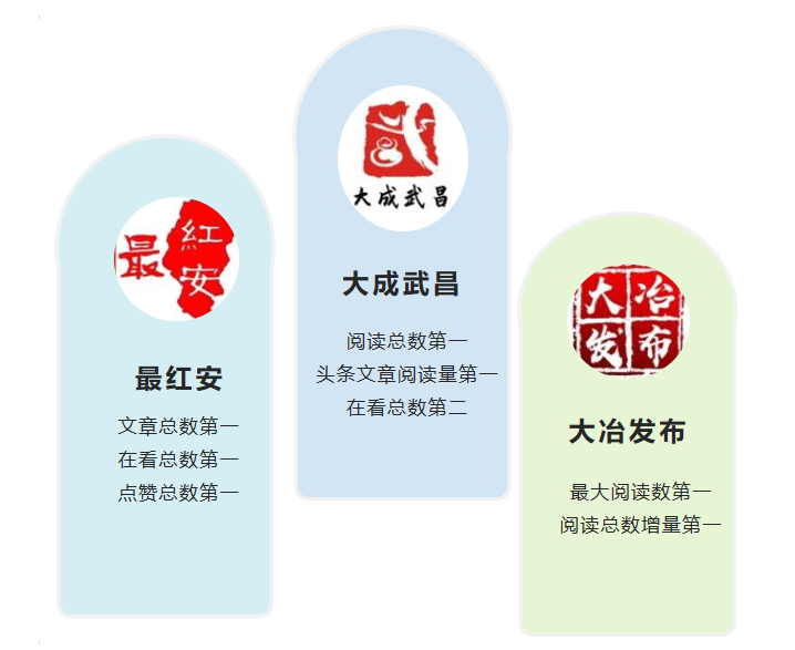 “大成武昌”以閱讀總數第一、點贊總數第二排在榜首;“最紅安”以文章總數第一、點贊總數第一、在看總數第一排在第二位;“大冶發布”以最大閱讀數第一、閱讀總數增量第一排第三名。其他賬號部分單項指數可圈可點,值得關注的是“漢陽知音”單項表現優秀,其平均閱讀數單項排名第一。