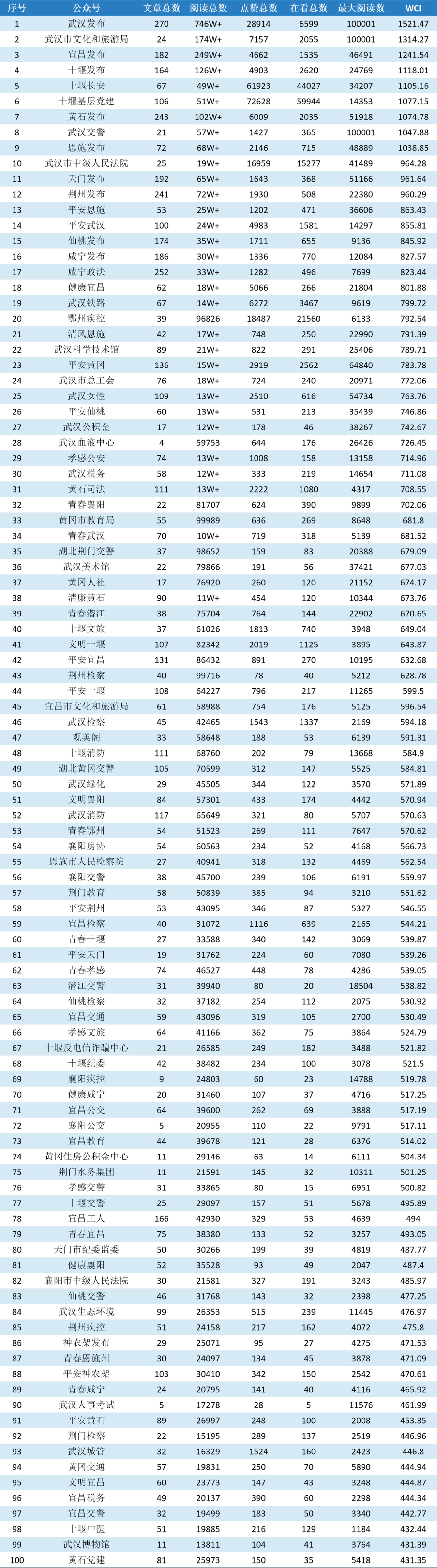 近五成賬號指數出現上漲 “武漢發布”閱讀量增長過百萬