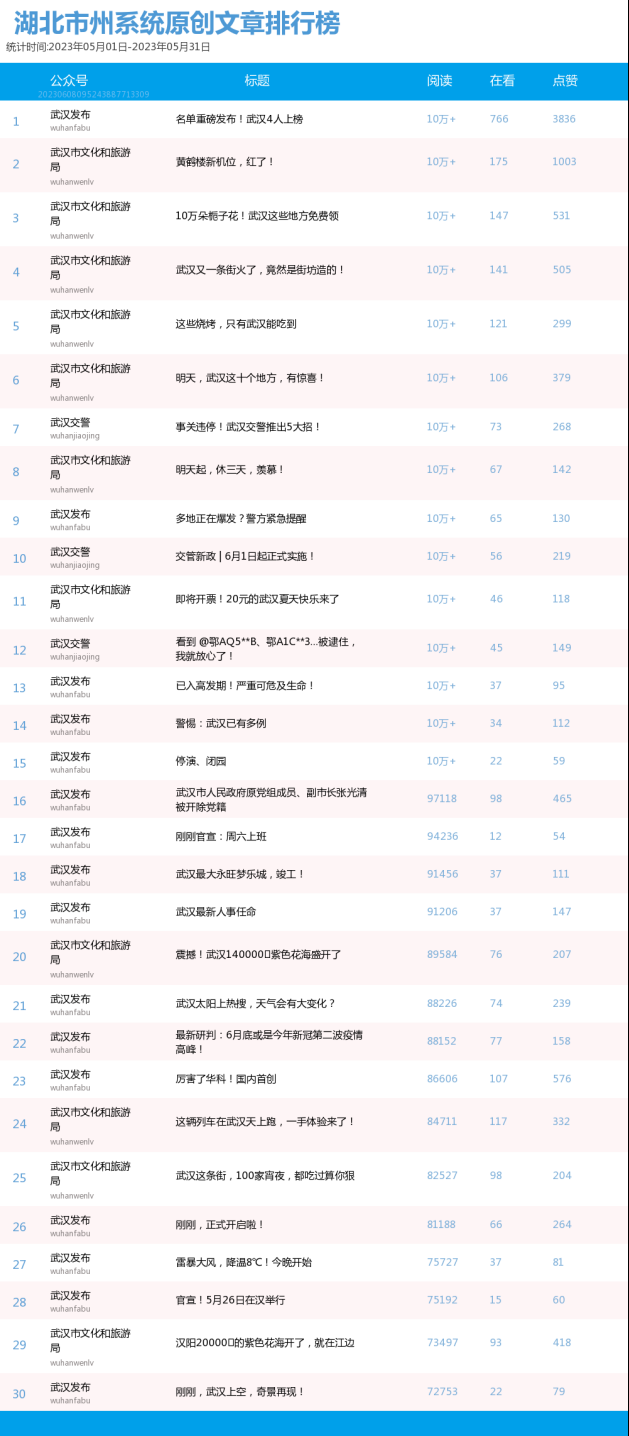 本期,“10W+”原創爆款文章數量較上月減少2篇,共計15篇。其中“武漢市文化和旅游局”保持優勢,仍有7篇文章閱讀量超10萬+;“武漢發布”有5篇爆款文章,較上期減少2篇;“武漢交警”3篇原創文章全部成為爆款文章,原創實力不容小覷。“武漢發布”推文《名單重磅發布!武漢4人上榜》榮登榜首;“武漢市文化和旅游局”推文《黃鶴樓新機位,紅了!》和《10萬朵梔子花!武漢這些地方免費領》分別位列第二和第三。