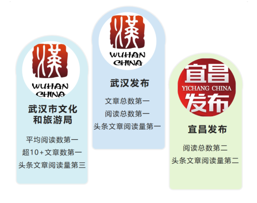 從閱讀總數來看,五成以上賬號閱讀總數增量上漲,共有54個賬號正向增長。其中,“武漢發布”閱讀總數增長過百萬,高居首位,達746W+;“宜昌發布”雖較上期減少20萬,閱讀量仍有249萬+,位居第二;此外,“武漢市文化和旅游局”“十堰發布”“黃石發布”閱讀量均過百萬。