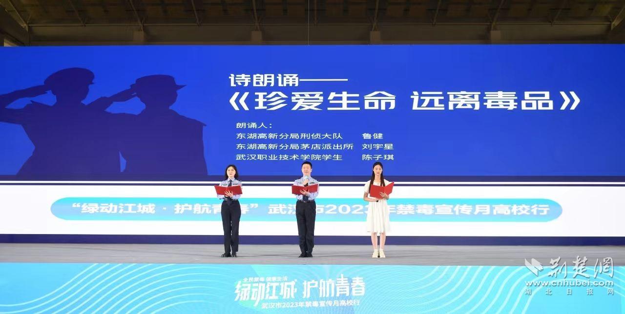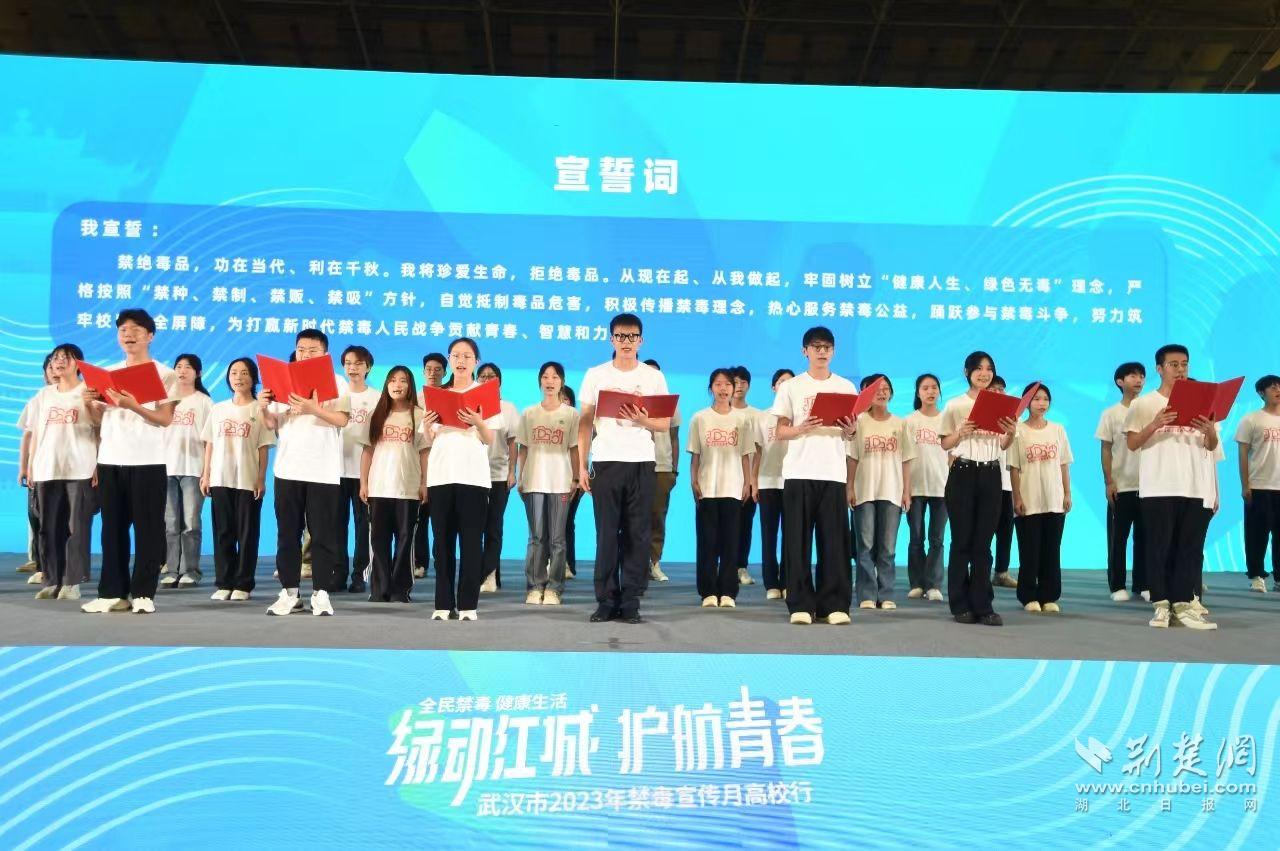 荊楚網(wǎng)(湖北日?qǐng)?bào)網(wǎng))訊(通訊員陳善文 張斌)“我將珍愛(ài)生命,拒絕毒品。自覺(jué)抵制毒品危害,積極傳播禁毒理念,熱心服務(wù)禁毒公益,踴躍參與禁毒斗爭(zhēng)?!?月16日上午,在江漢大學(xué)體育場(chǎng)的“綠動(dòng)江城·護(hù)航青春”高校行禁毒宣傳活動(dòng)現(xiàn)場(chǎng),來(lái)自全市83所高校的近2000名師生代表共同發(fā)出青春誓言。這場(chǎng)由武漢市禁毒委聯(lián)合江漢大學(xué)舉辦的活動(dòng),助力武漢地區(qū)高校形成自覺(jué)抵制毒品的濃厚氛圍。