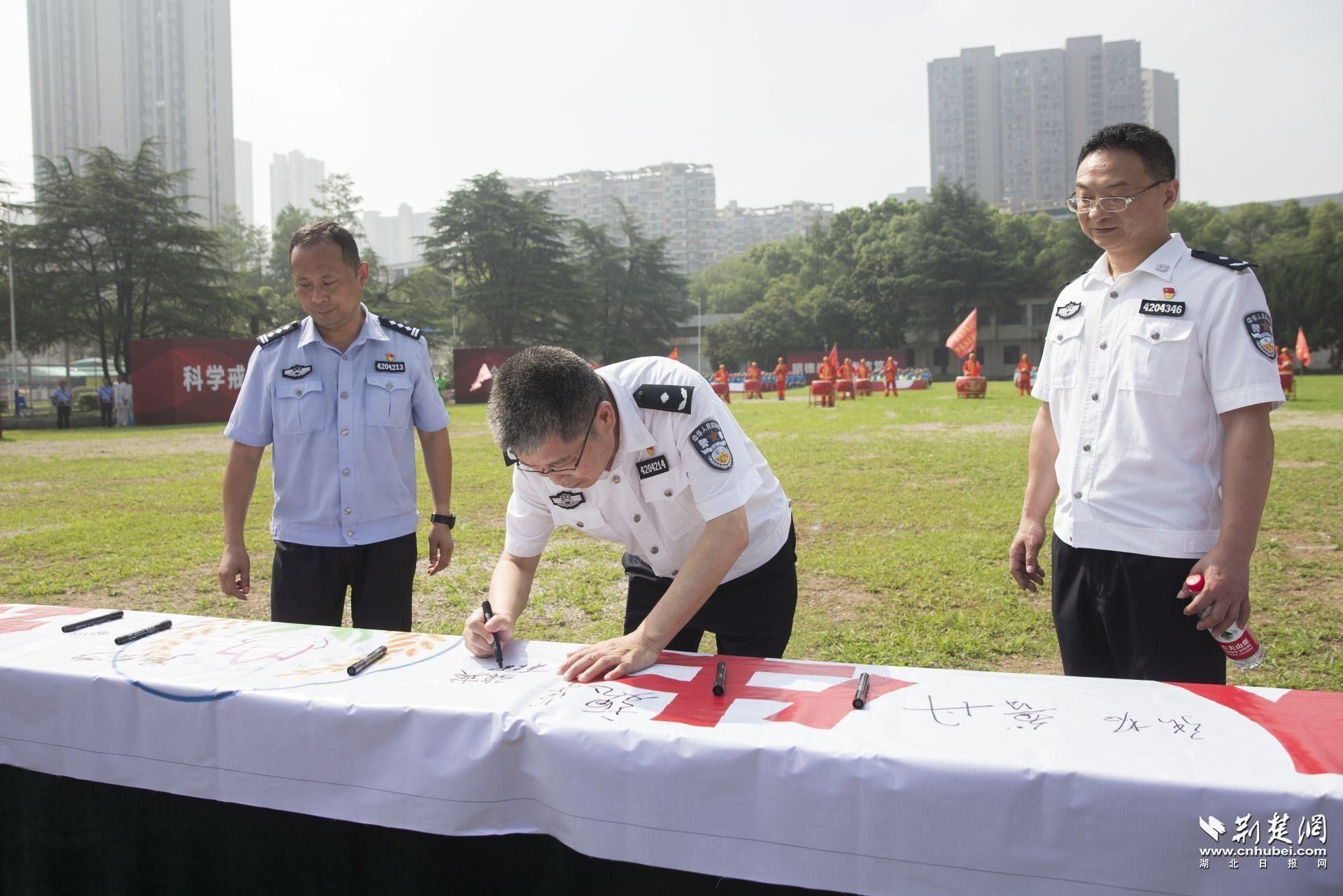 武漢市司法局分管領導韓毓龍在禁毒宣傳橫幅上簽名。劉建維 攝