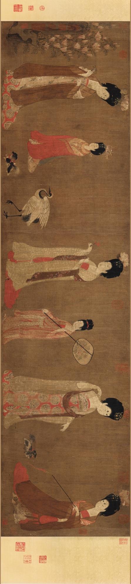 畫中有簪花仕女五人,執(zhí)扇侍女一人