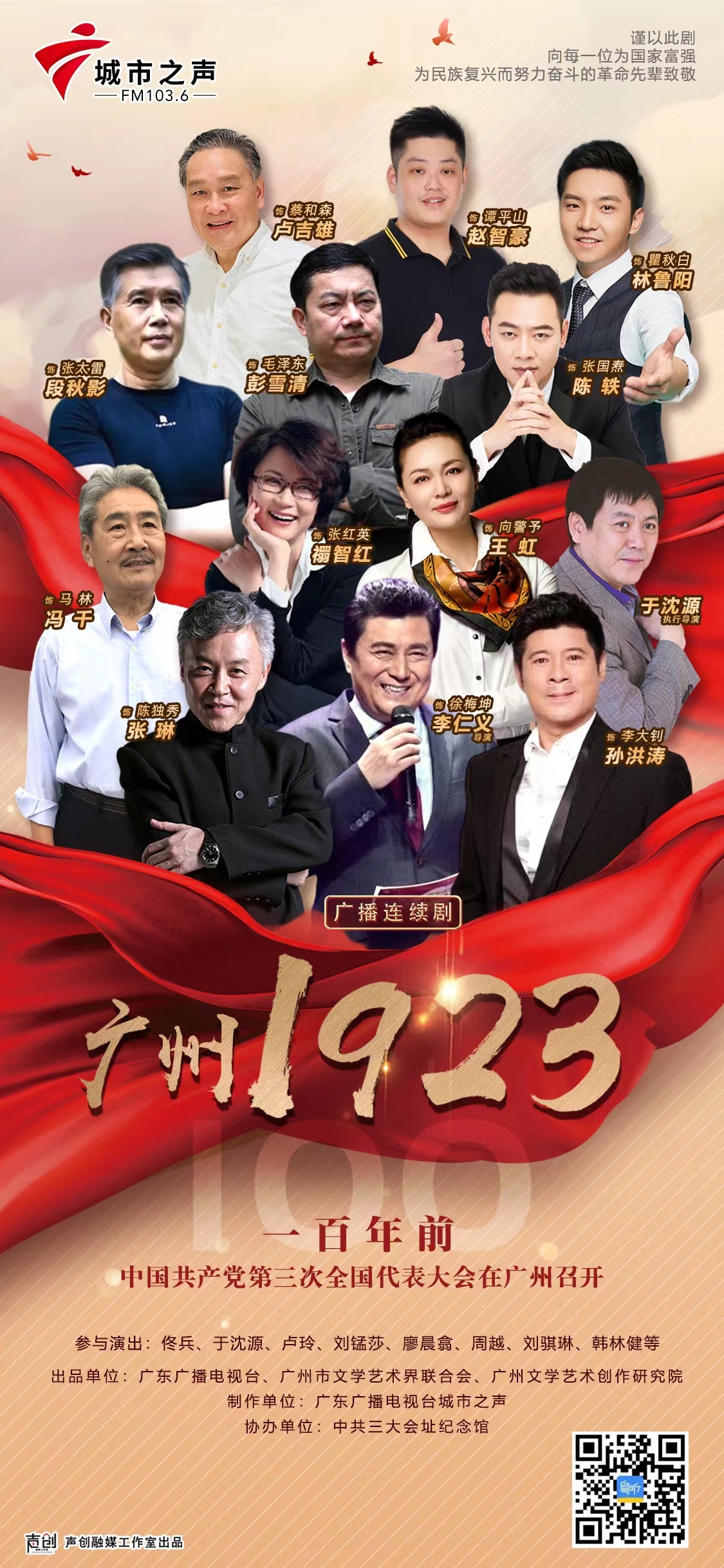 6月12日,廣播劇《廣州1923》在廣東廣播電視臺(tái)城市之聲首播,并分別于6月17日、7月2日在廣東廣播電視臺(tái)城市之聲等頻道重播。《廣州1923》由廣東廣播電視臺(tái)、廣州市文學(xué)藝術(shù)界聯(lián)合會(huì)、廣州文學(xué)藝術(shù)創(chuàng)作研究院聯(lián)合出品,中共三大會(huì)址紀(jì)念館協(xié)辦,匯聚了優(yōu)秀創(chuàng)編人員和黨史專家實(shí)力打造。廣播劇講的就是9天會(huì)議的過程,情節(jié)張弛有度,劇情跌宕起伏,十分吸引聽眾。