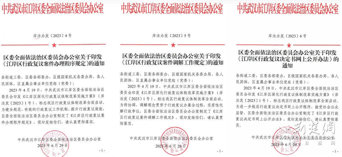 荊楚網(湖北日報網)訊(通訊員孫榮榮 張威)6月29日,江岸區全面依法治區委員會辦公室正式印發《江岸區行政復議案件辦理程序規定》、《江岸區行政復議案件調解工作規定》以及《江岸區行政復議決定書網上公開辦法》三項規定,推動江岸區行政復議工作邁上工作流程更規范、復議決定更透明、化解爭議更高效的新臺階。