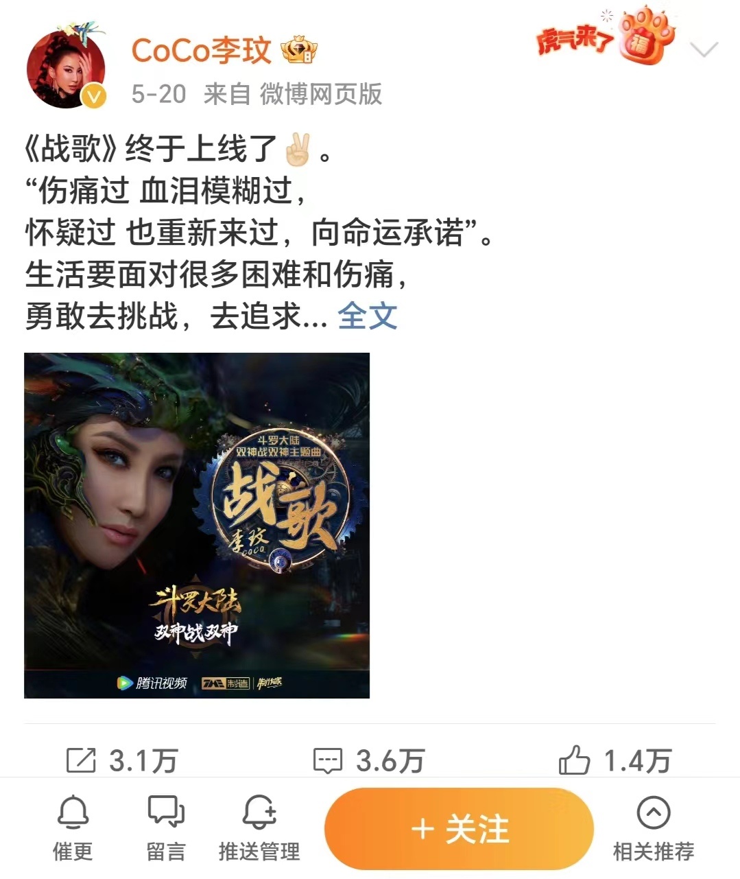 5月20日,新歌《戰神》上線。李玟的微博也停留在了這一天。