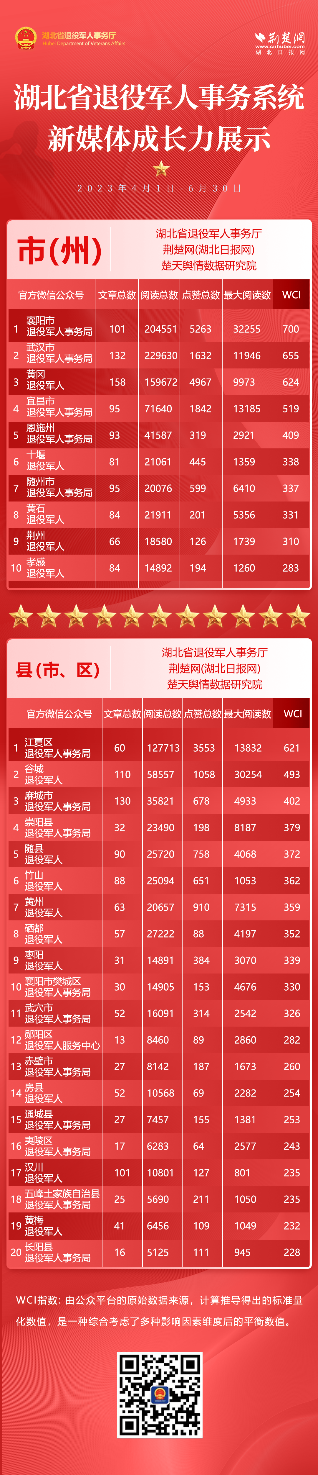 為進一步推動全省退役軍人事務系統打造“大宣傳”工作格局、構建新媒體“宣傳矩陣”,7月6日,湖北省退役軍人事務廳聯合荊楚網(湖北日報網)、楚天輿情數據研究院,對2023年第二季度全省退役軍人事務系統新媒體成長力進行展示。