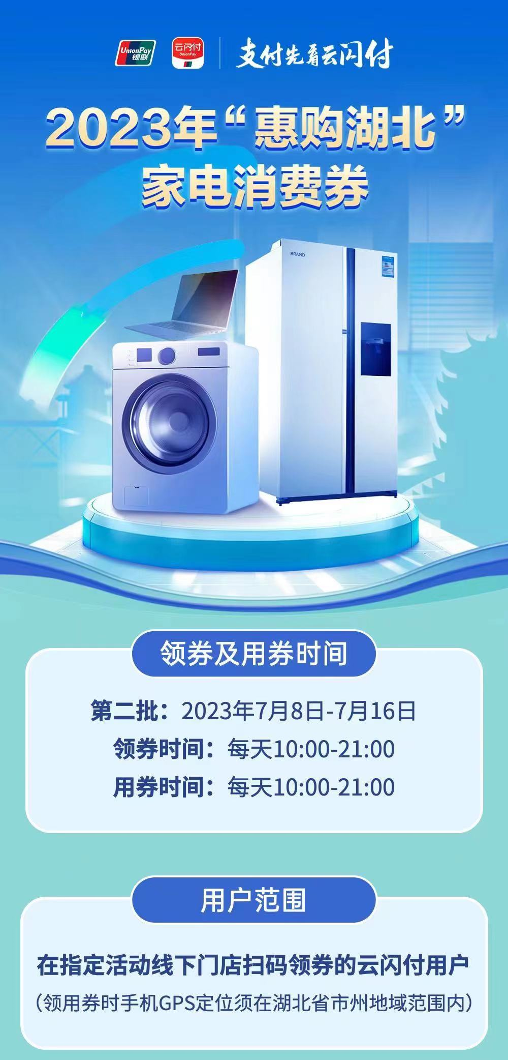 隨著三伏天的到來,“燒烤模式”即將開啟,7月8日起,第二批“惠購湖北”家電消費券又將發放,活動時間為7月8日-7月 16日每天10:00-21:00。與以往消費券在APP上領券不同,此次消費券需消費者到活動商家門店現場掃碼領取,湖北轄區內的市民可到指定參與活動的家電商戶現場,使用云閃付APP掃碼領券,領券用券時需打開云閃付GPS定位權限。本次家電消費券設100元、300元、500元三種面額,10倍核銷門檻,即在扣除平臺及商戶的各類優惠后,消費者購買的家電待付金額分別達到1000元、3000元、5000元,即可對應核銷使用1張家電消費券。一筆交易只能核銷1張家電消費券,領取的消費券需在當天21:00前核銷使用,單批次活動期間最多可核銷2張家電消費券。