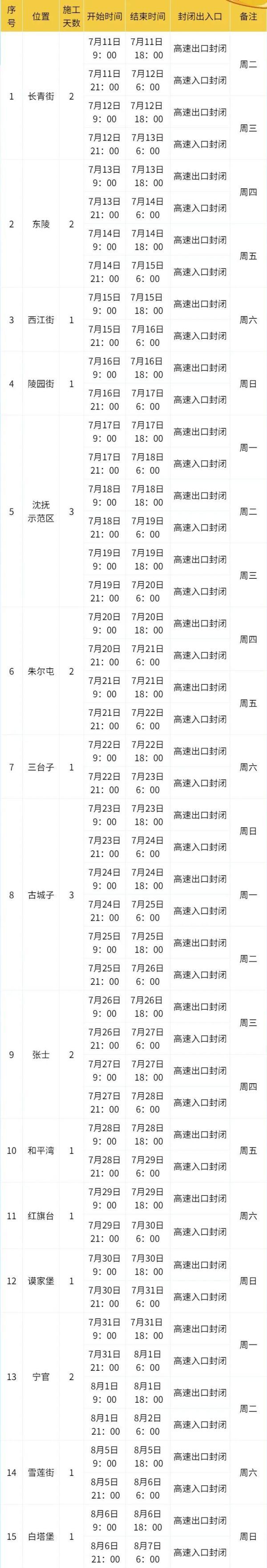 沈陽繞城高速公路因道路養護施工需要,2023年7月11日起至2023年8月6日(遇特殊天氣或政策性停工,工期順延),將依次對沈陽繞城高速公路長青街、東陵、西江街、陵園街、沈撫示范區、朱爾屯、三臺子、古城子、張士、和平灣、紅旗臺、謨家堡、寧官、雪蓮街、白塔堡共15座收費站出入口進行臨時封閉施工,每日只封閉單個收費站。