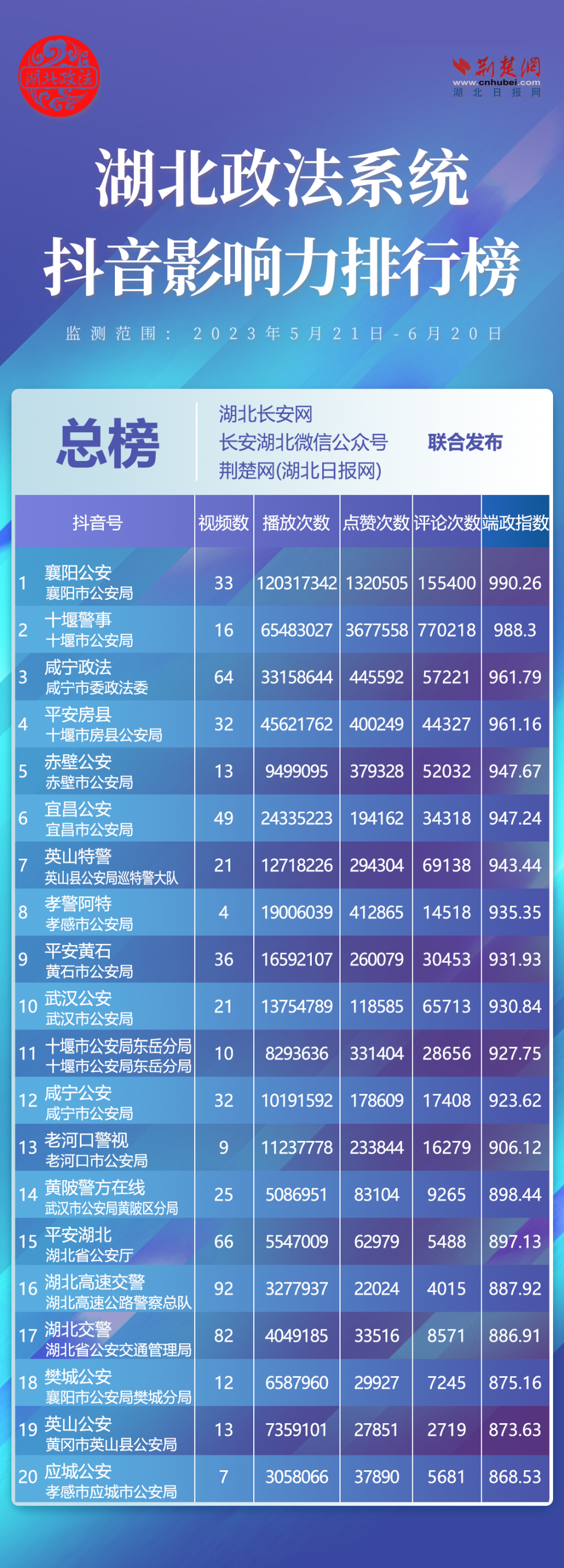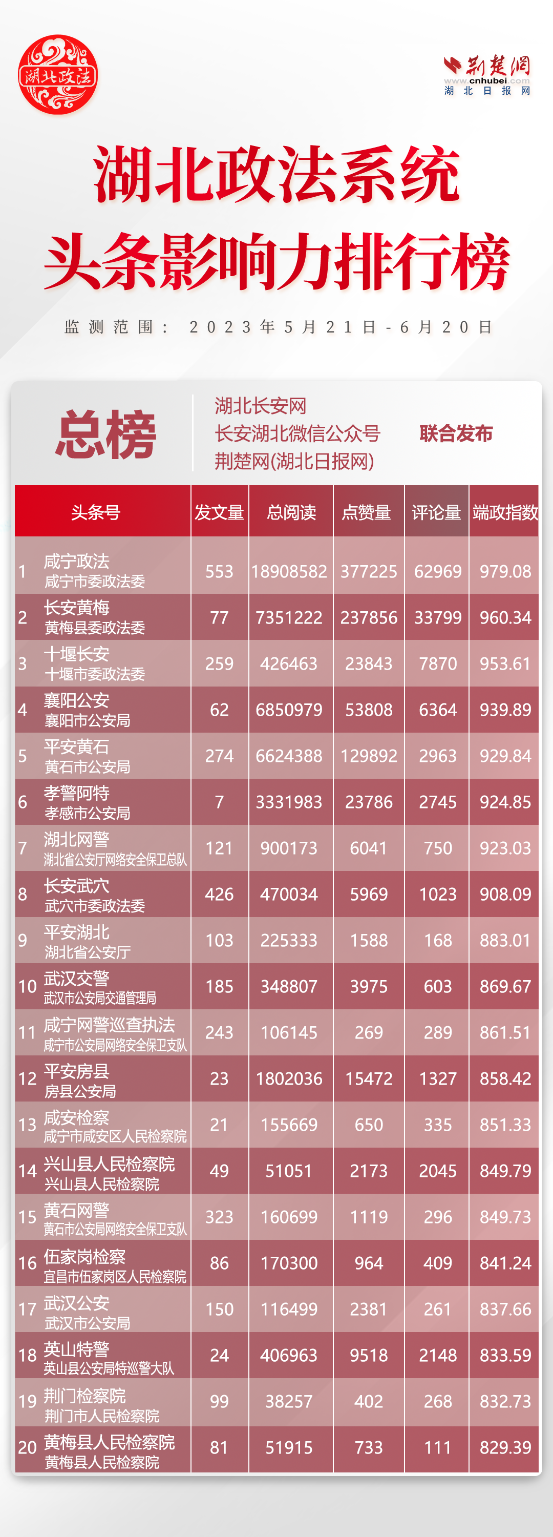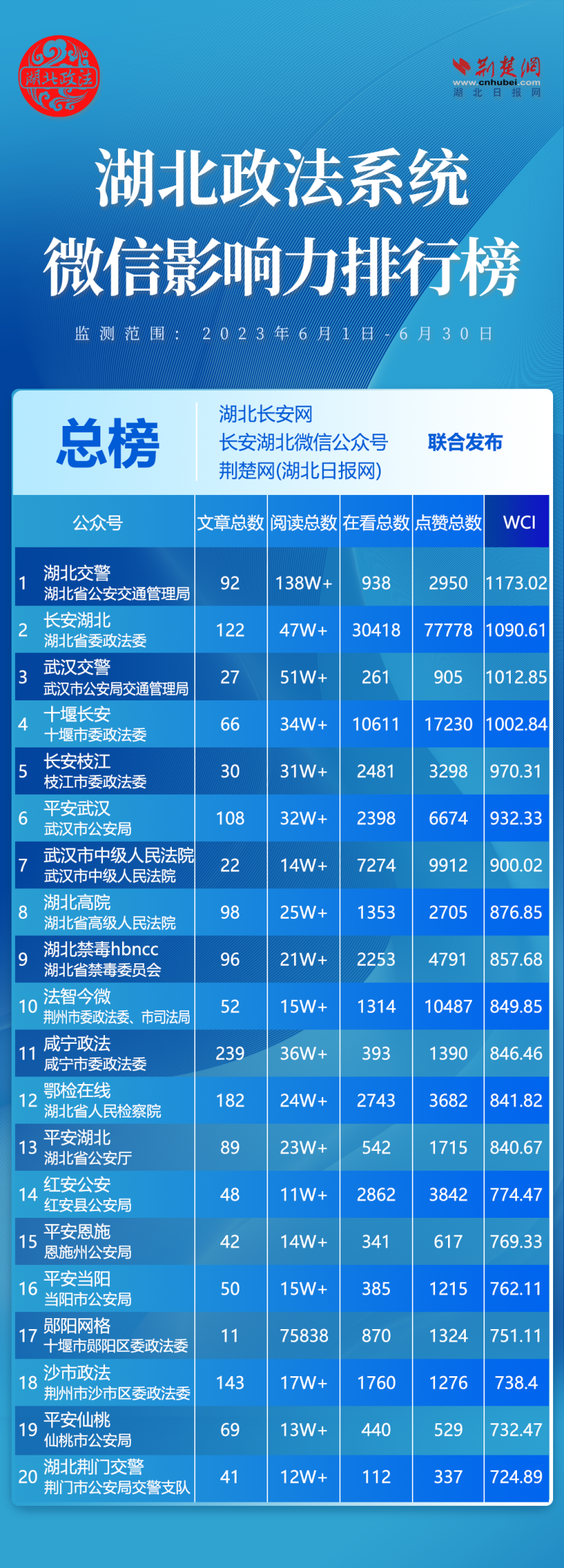 7月10日,湖北省委政法委官網湖北長安網、官微長安湖北,聯合荊楚網(湖北日報網)、楚天輿情數據研究院發布湖北政法系統新媒體影響力排行6月榜單。具體榜單如下: