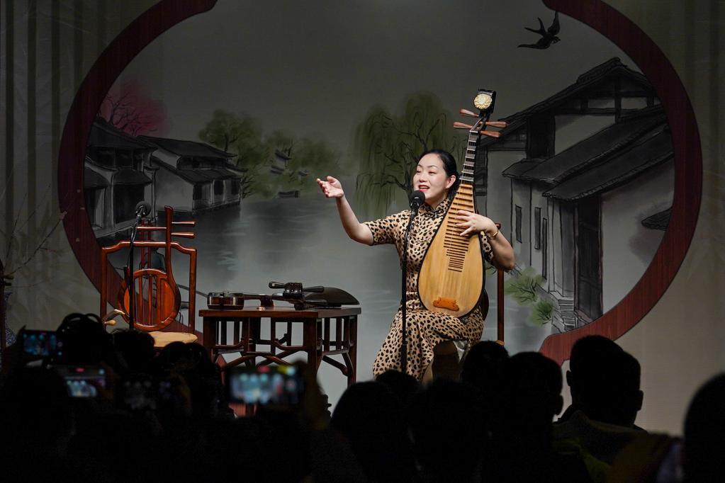 評彈演員在蘇州市姑蘇區一處評彈茶館演唱蘇州評彈版《聲聲慢》(2023年4月5日攝)。新華社記者 李博 攝